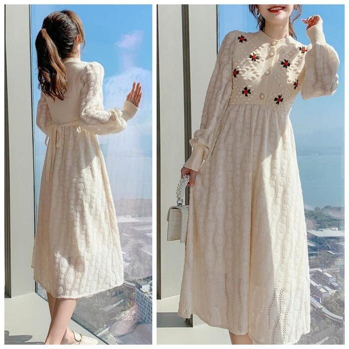 全2色 大きいサイズ 体型カバー ワンピース ワンピ ドレス ニット 刺繍 レース 袖あり パフスリーブ 小花 レディース エレガント きれいめ カジュアル 長袖 大人 可愛い フェミニン ミモレ丈 ハイウエスト リボン ホワイト 白 ブラック 黒 春 秋 冬 20代 30代 40代 50代
