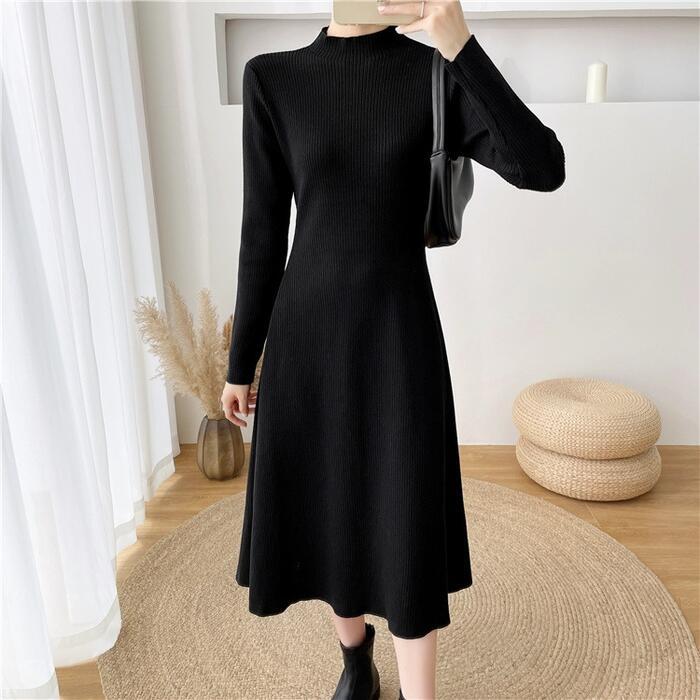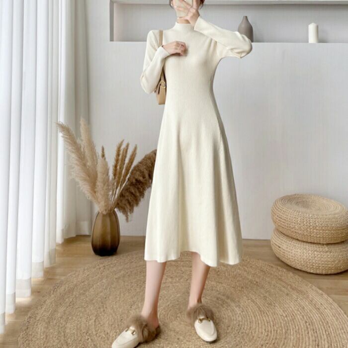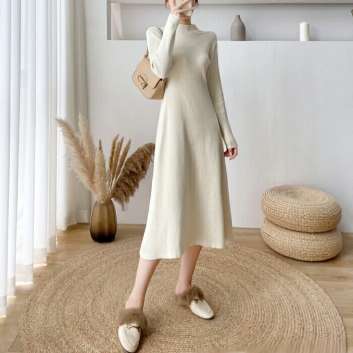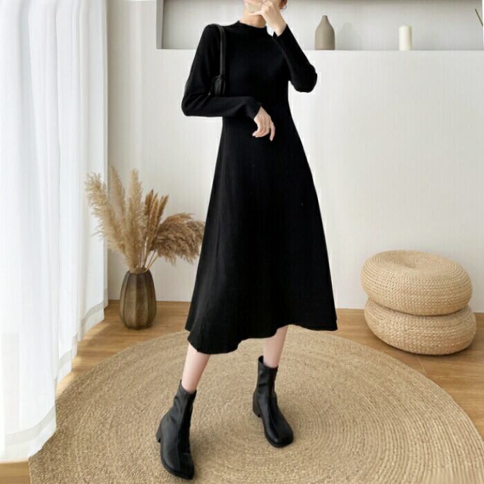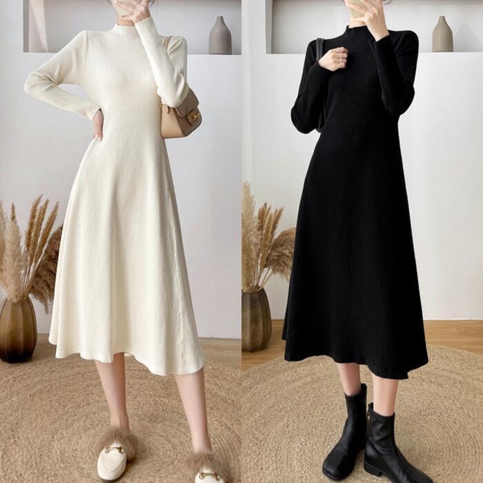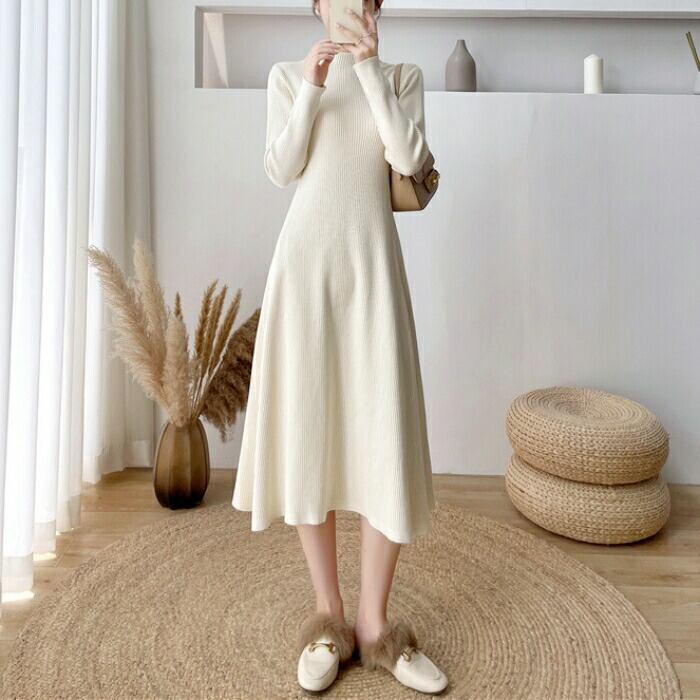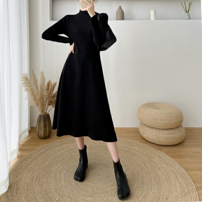 全2色 大きいサイズ 体型カバー ワンピース ワンピ ドレス ニット 袖あり ハイネック リブ レディース エレガント きれいめ カジュアル 長袖 大人 可愛い フェミニン ミモレ丈 Aライン シンプル ハイウエスト ベージュ ブラック 黒 春 秋 冬 20代 30代 40代 50代