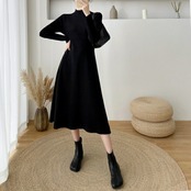 Aラインシルエットがエレガントなニットワンピース。