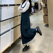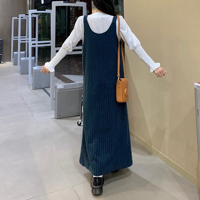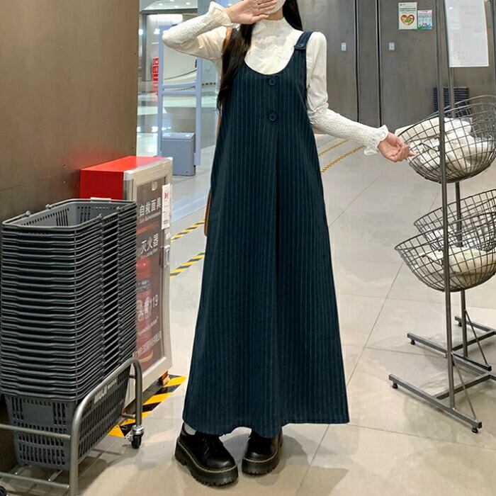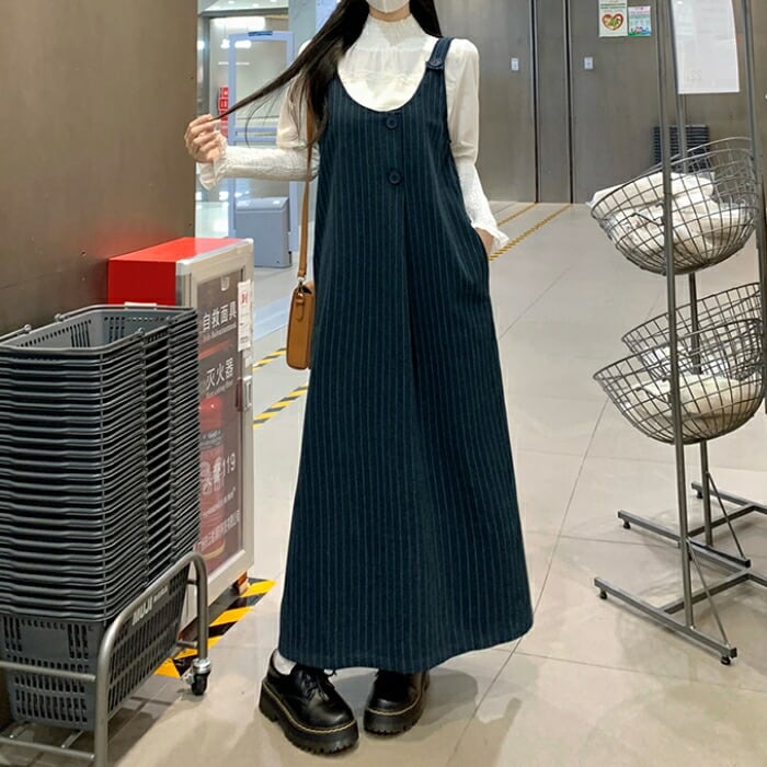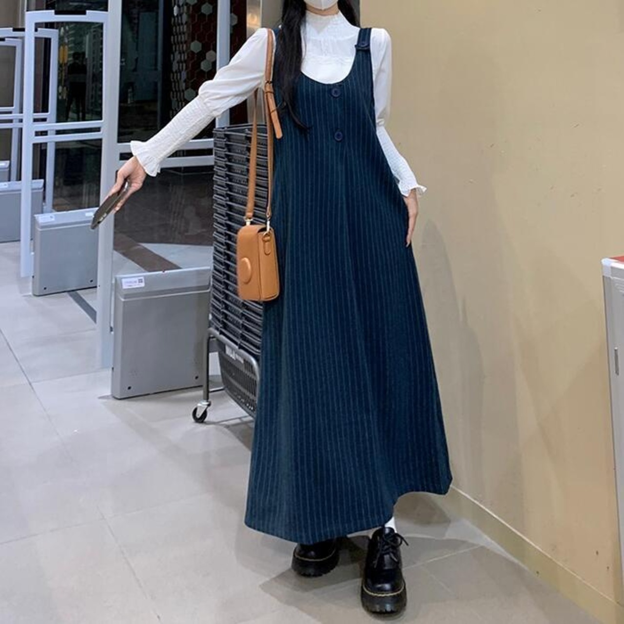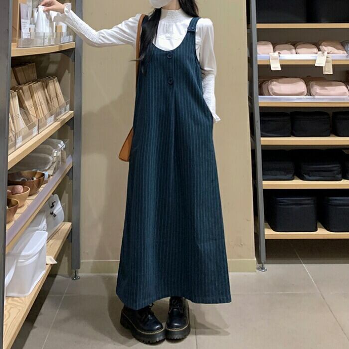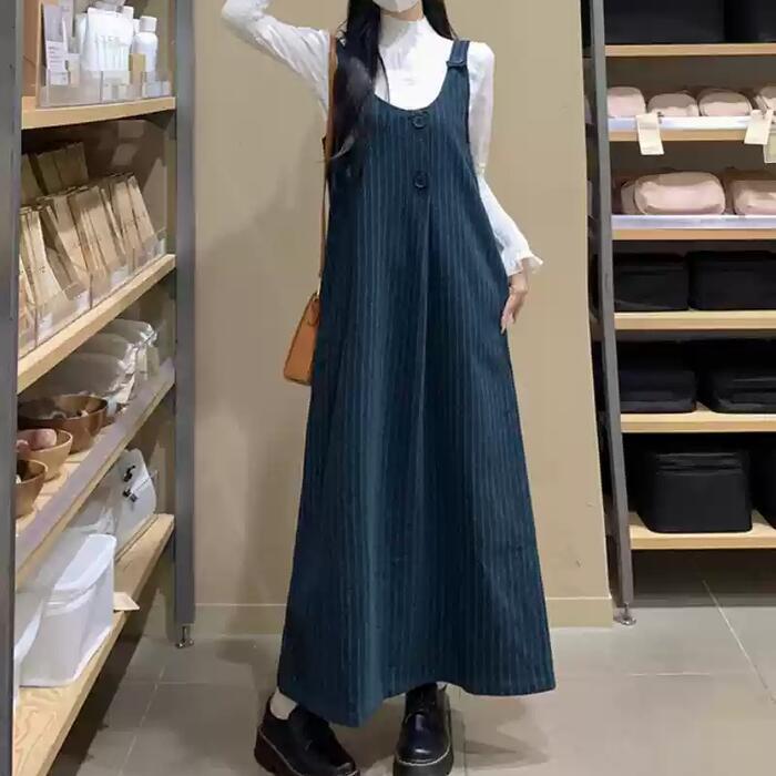 体型カバー ゆったり 大きいサイズ ワンピース ワンピ ドレス ジャンパースカート レイヤード ストライプ レディース エレガント きれいめ カジュアル 大人 可愛い フェミニン ノースリーブ ロング丈 重ね着 青 ブルー オールシーズン 春 秋 冬 20代 30代 40代 50代