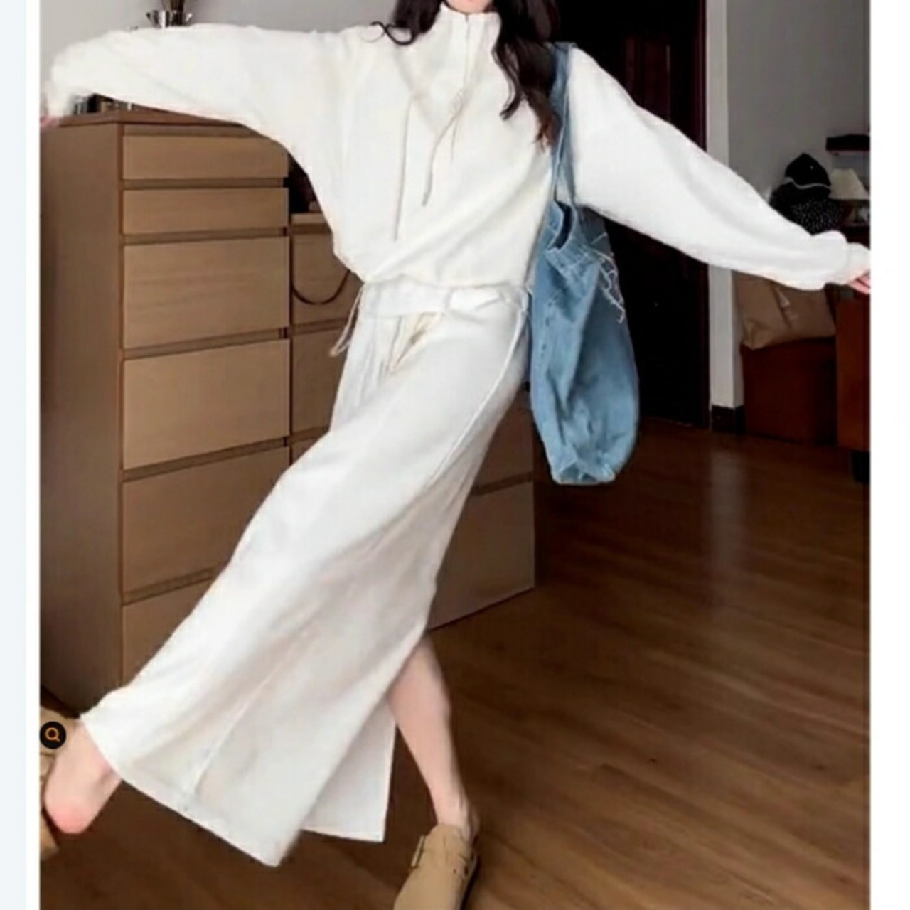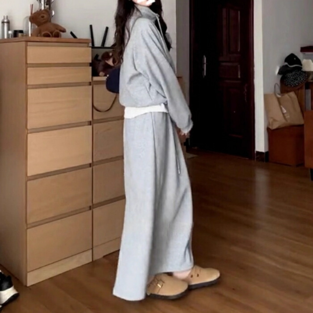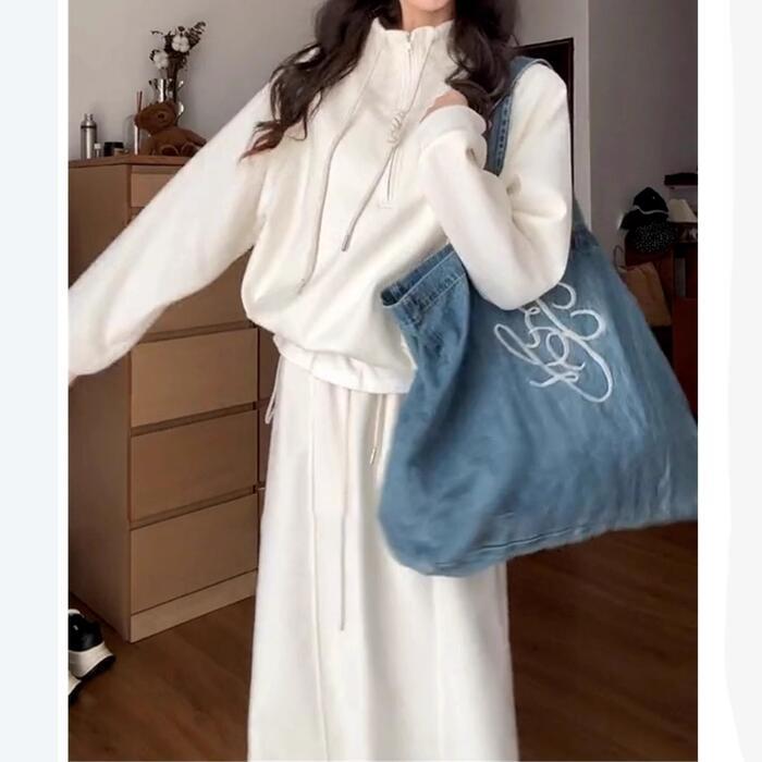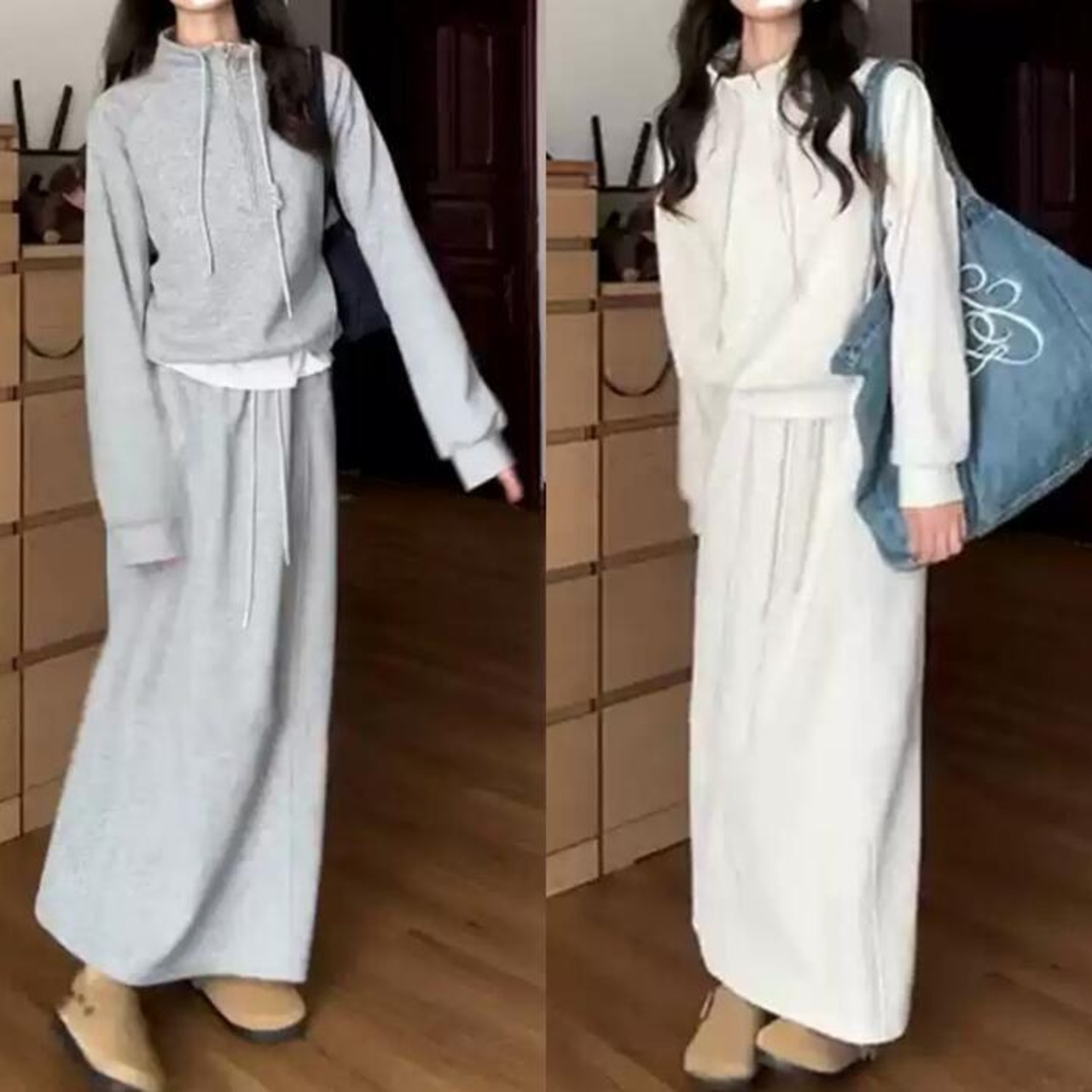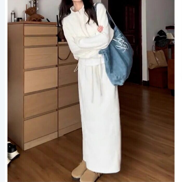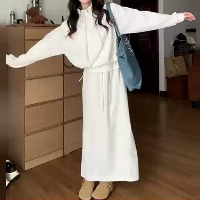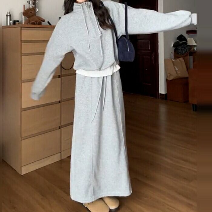 ハイネックのハーフジップトップス&スカートのスウェットセットアップ。