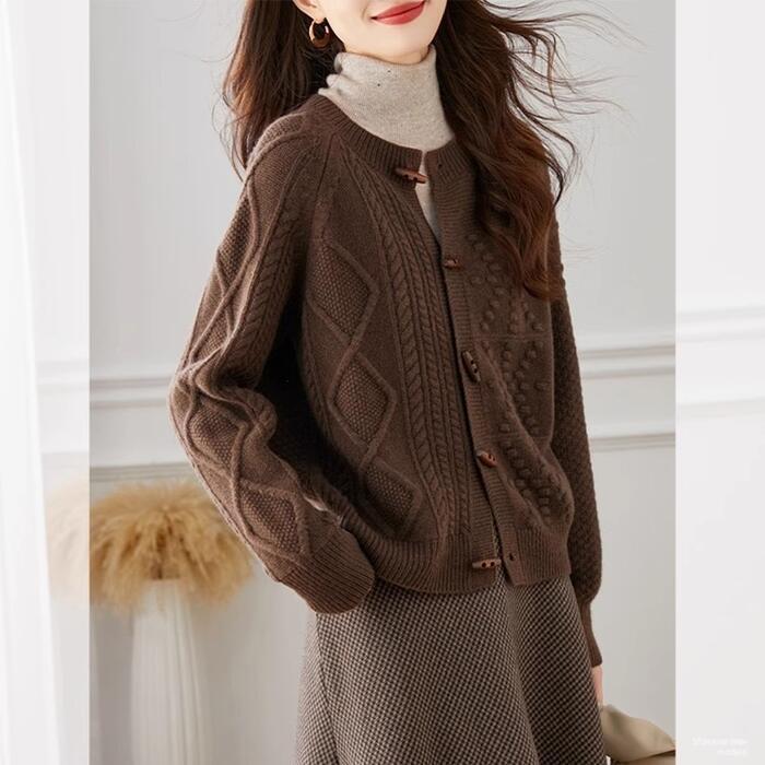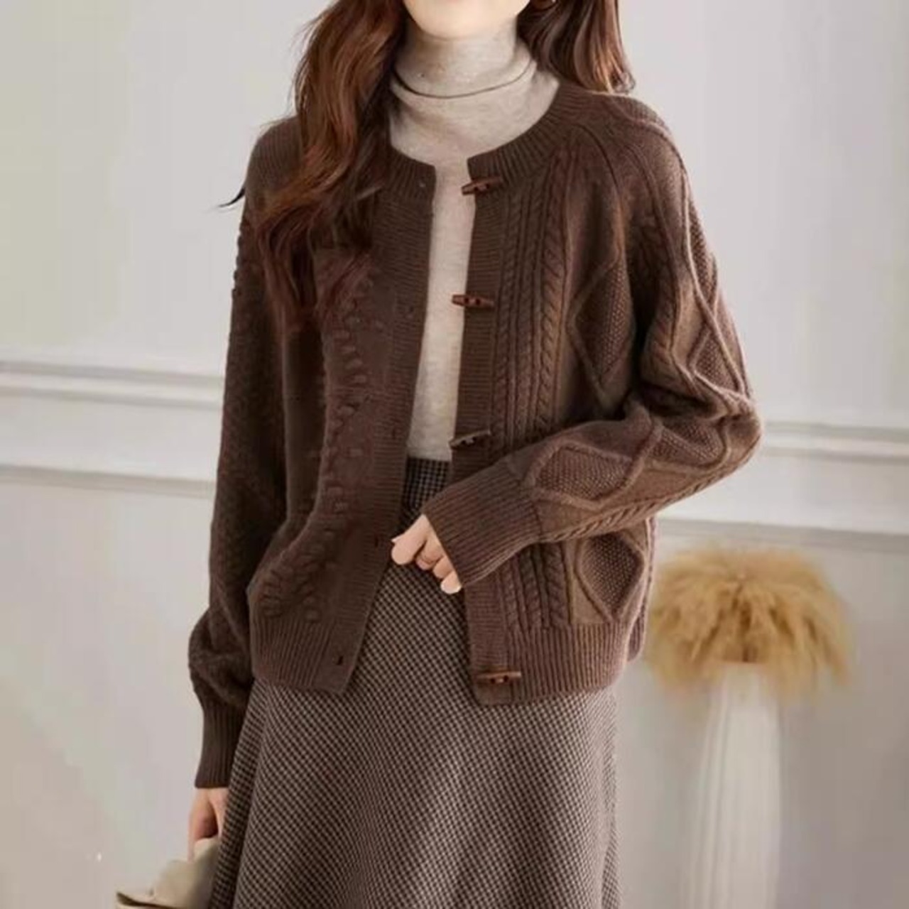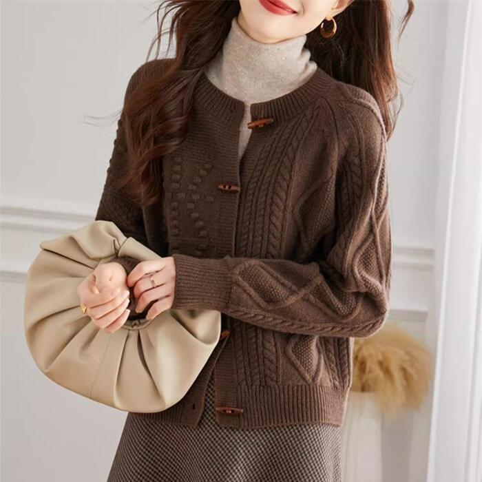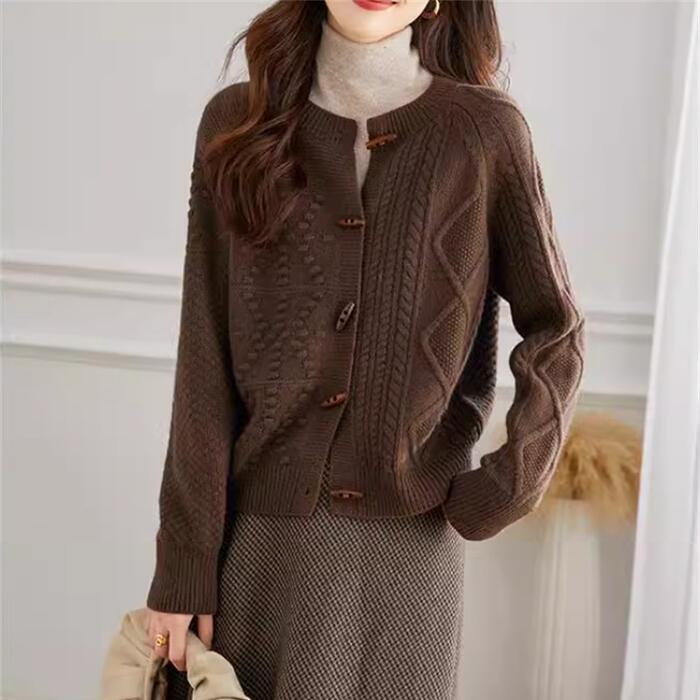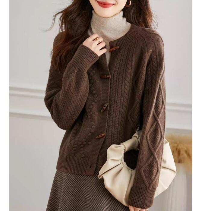 全2色 大きいサイズ 体型カバー ウール トップス ニット カーディガン カットソー セーター レディース エレガント 大人 可愛い きれいめ カジュアル フェミニン 長袖 シンプル ベーシック ケーブル アシンメトリー トグルボタン ブラウン ベージュ 春 秋 冬 20代 30代 40代 50代