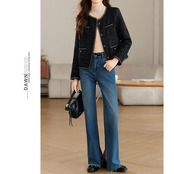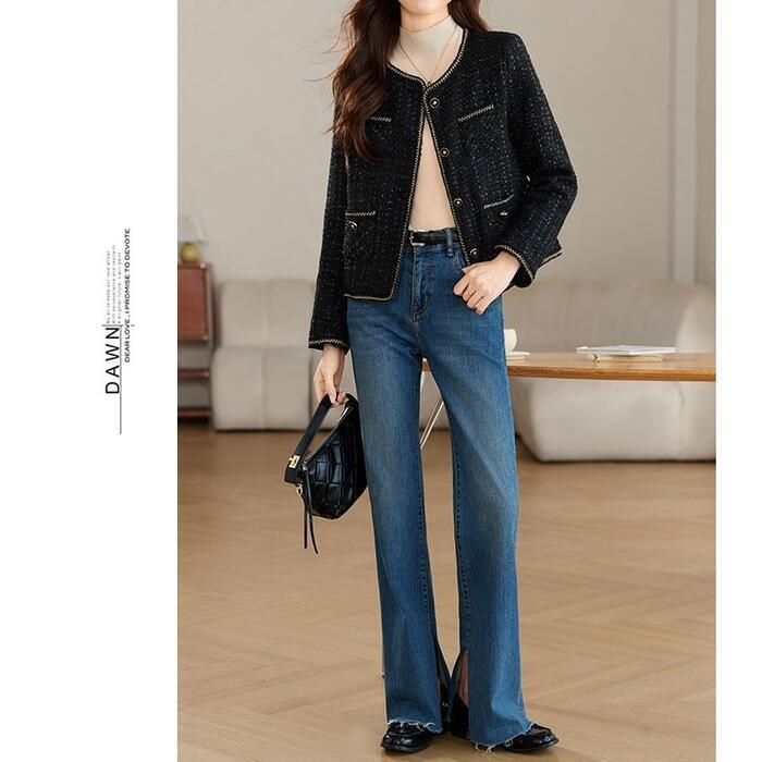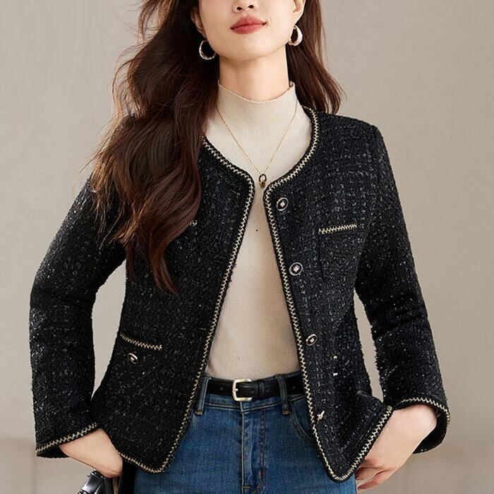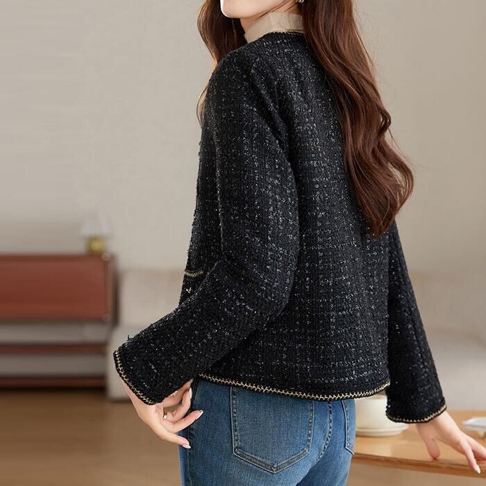 ノーカラーデザインで顔周りをすっきりとみせるツイードジャケット。