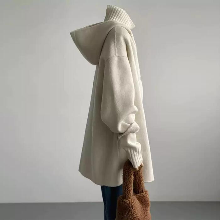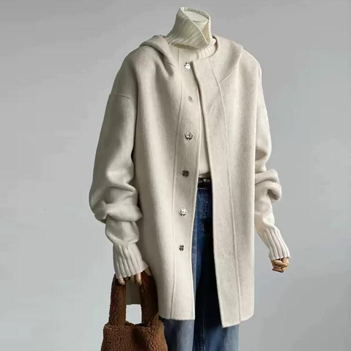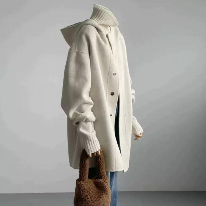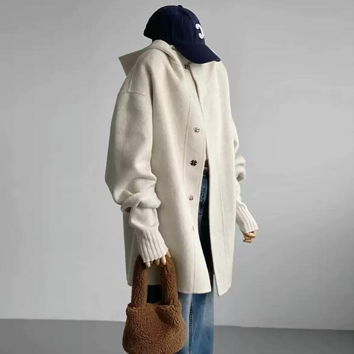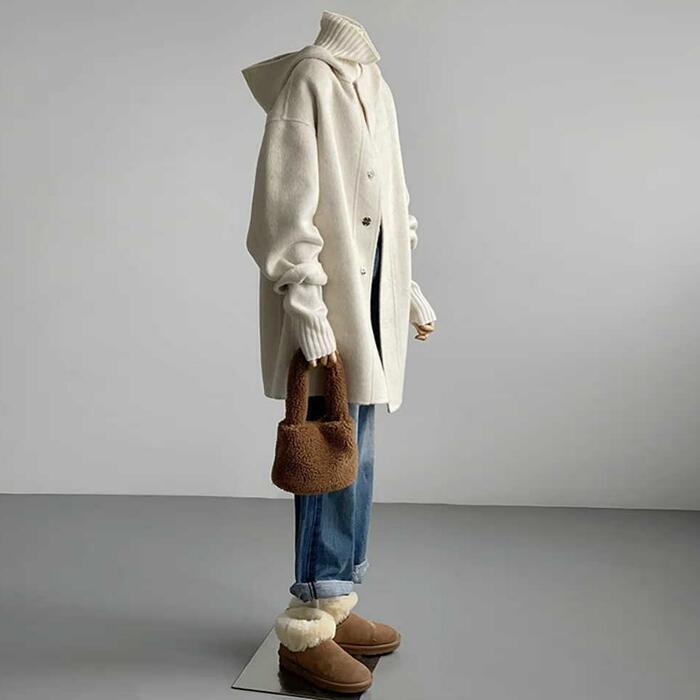 首元をすっきりと見せるノーカラーで、マフラーやストールとの相性も抜群です。