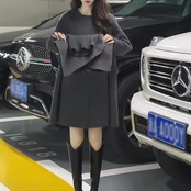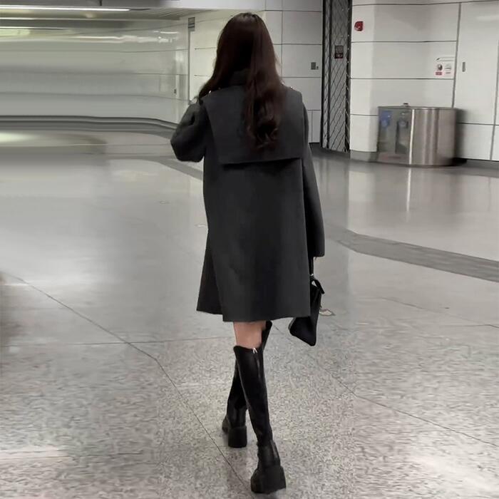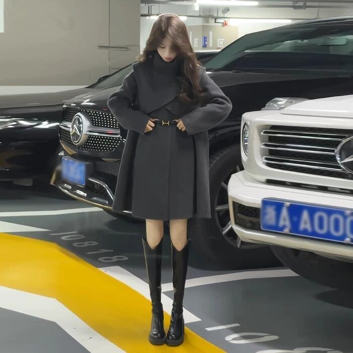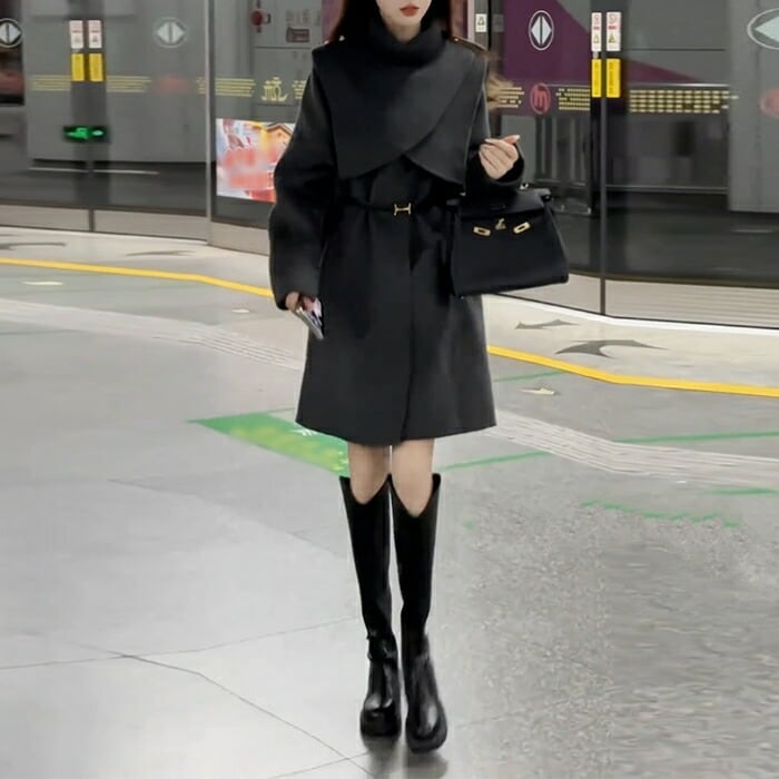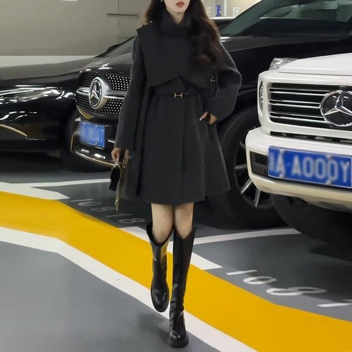 ノーカラーのコートにタートルネックのケープを合わせたアウター。
