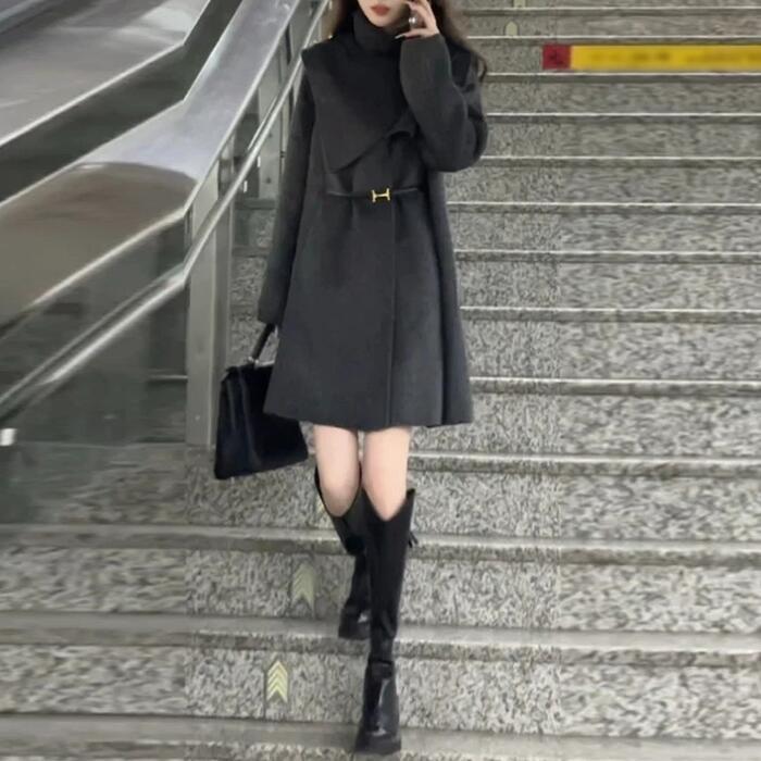 大きいサイズ アウター コート ジャケット ケープ タートルネック ノーカラー 羽織り レディース エレガント 大人 可愛い きれいめ カジュアル フェミニン ウエストベルト 2点セット 体型カバー グレー 春 秋 冬 20代 30代 40代 50代