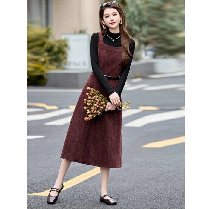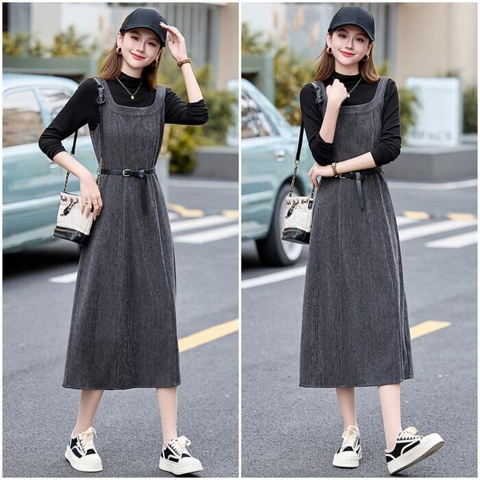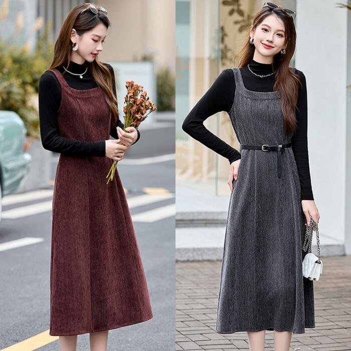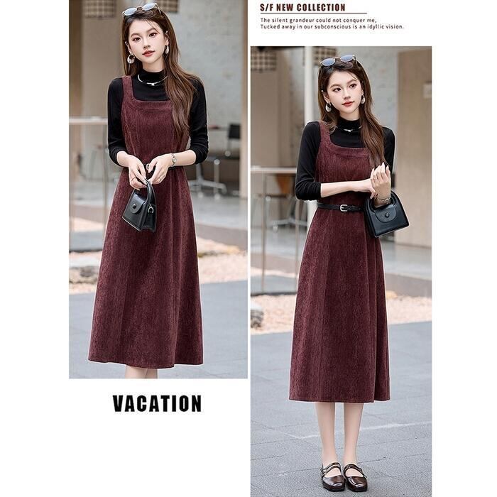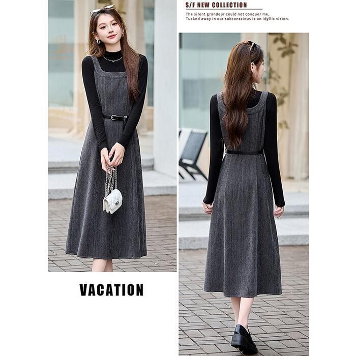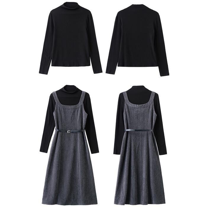 全2色 大きいサイズ シンプル おしゃれ フェミニン レイヤード セットアップ レディース ワンピース ジャンパースカート タートルネック インナー ハイネック 長袖 カットソー 2点セット エレガント カジュアル きれいめ ミモレ丈 大人 可愛い レッド 赤 グレー ブラック 黒 春 秋 冬 20代 30代 40代 50代