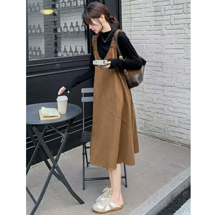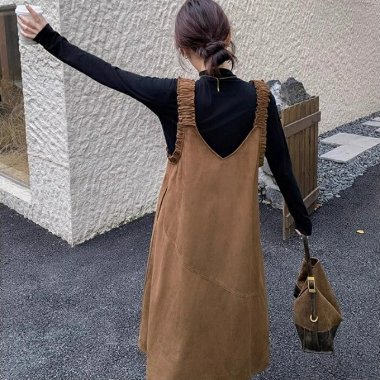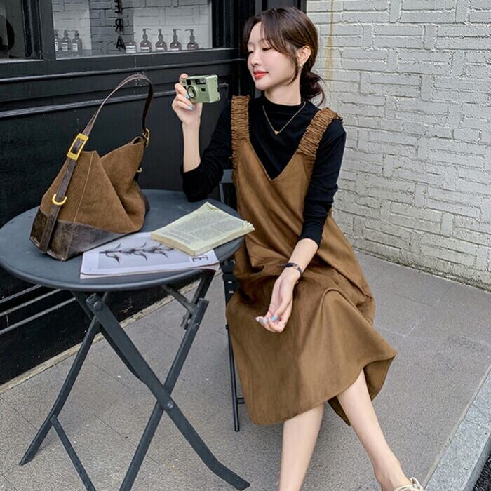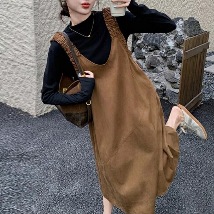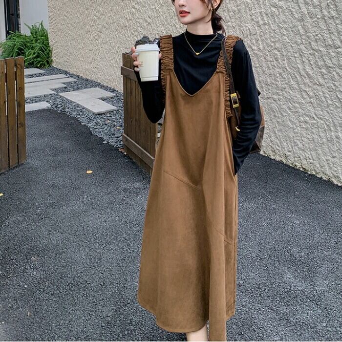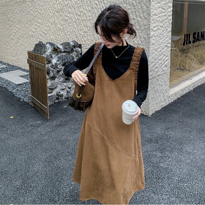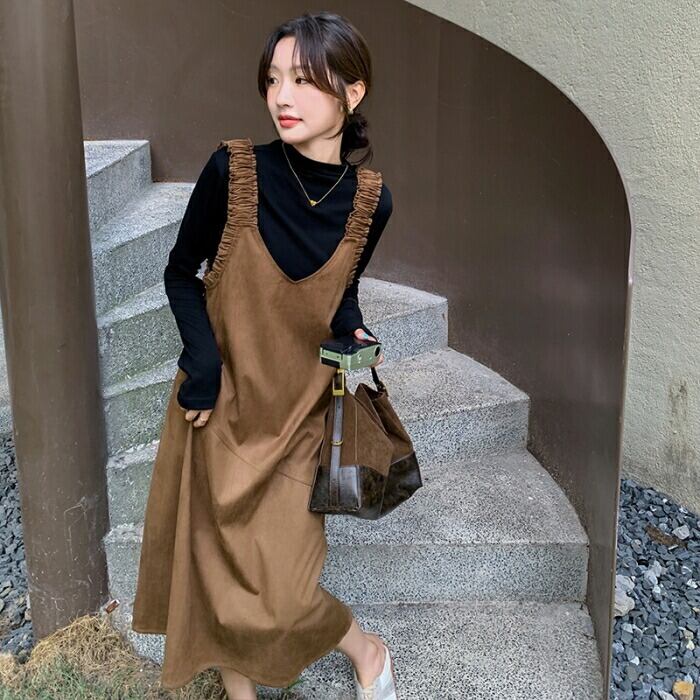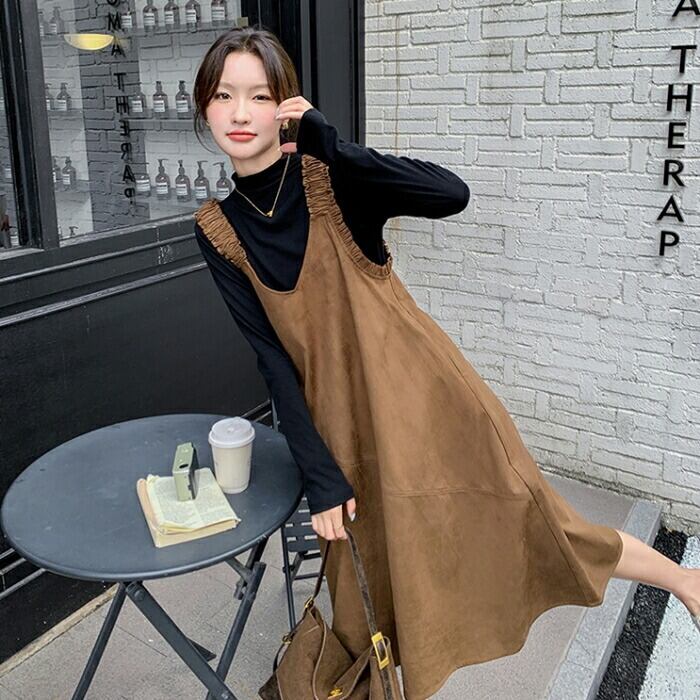 ハイネックのトップス&スエード調ジャンパースカートのセット。
