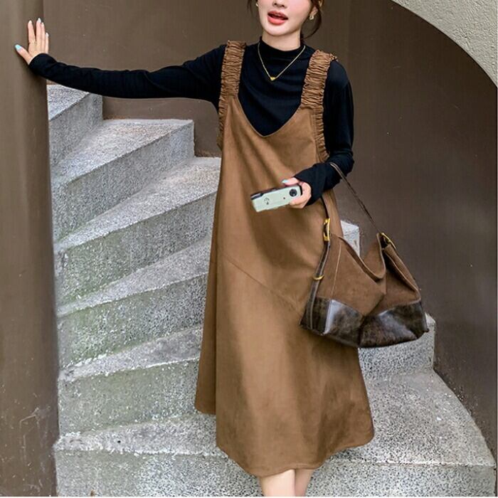 大きいサイズ シンプル おしゃれ フェミニン レイヤード セットアップ レディース ワンピース ジャンパースカート タートルネック インナー ハイネック 長袖 カットソー 2点セット エレガント カジュアル きれいめ ミモレ丈 大人 可愛い ベージュ ブラック 黒 春 秋 冬 20代 30代 40代 50代