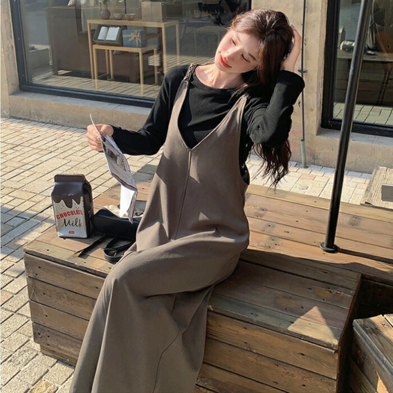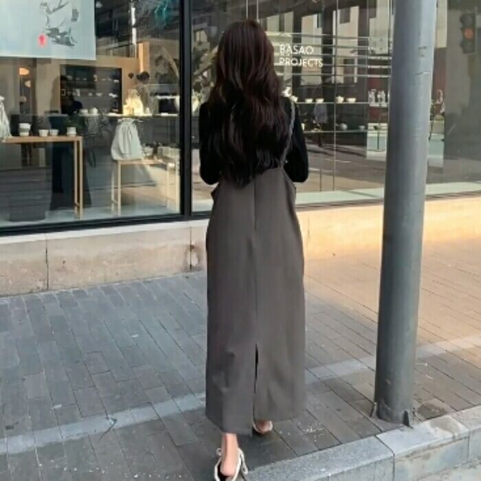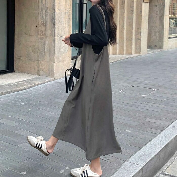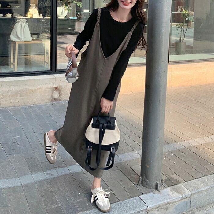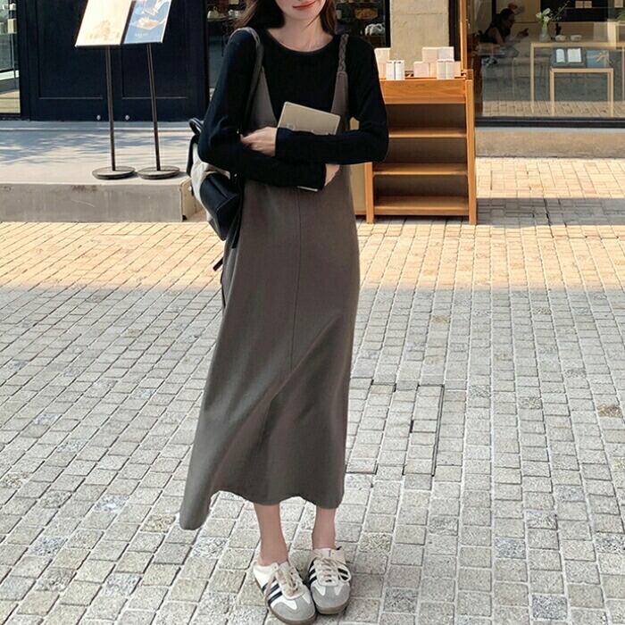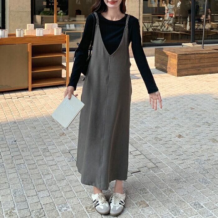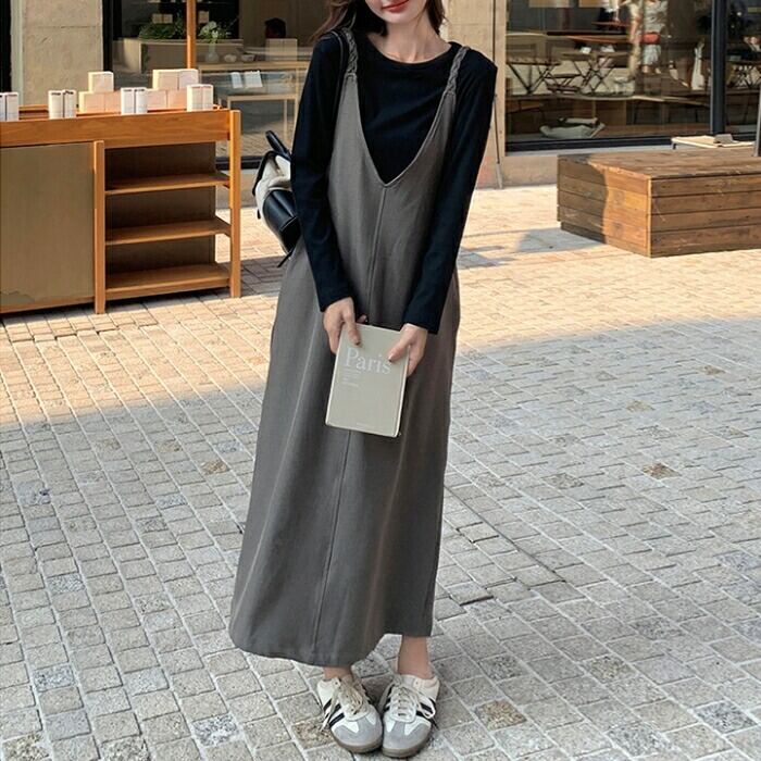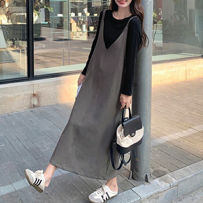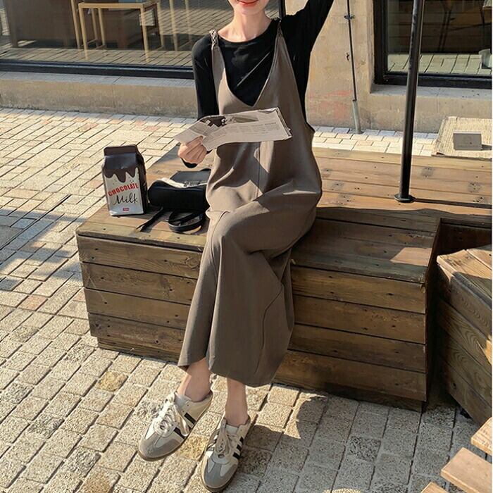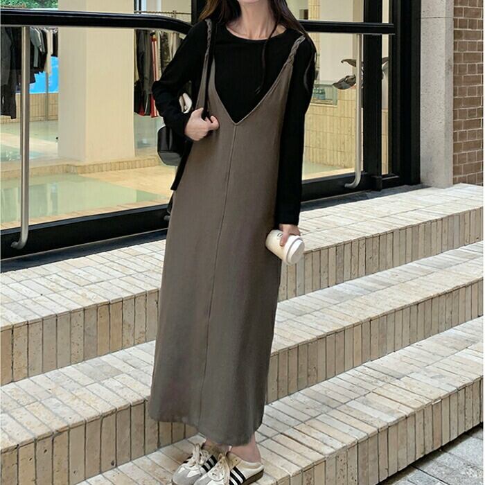 大きいサイズ 体型カバー ゆったり おしゃれ フェミニン レイヤード セットアップ レディース ワンピース ジャンパースカート サロペットスカート インナー Tシャツ 長袖 カットソー 2点セット エレガント カジュアル ロング丈 大人 可愛い きれいめ ブラウン ブラック 黒 春 秋 冬 20代 30代 40代 50代