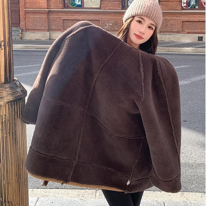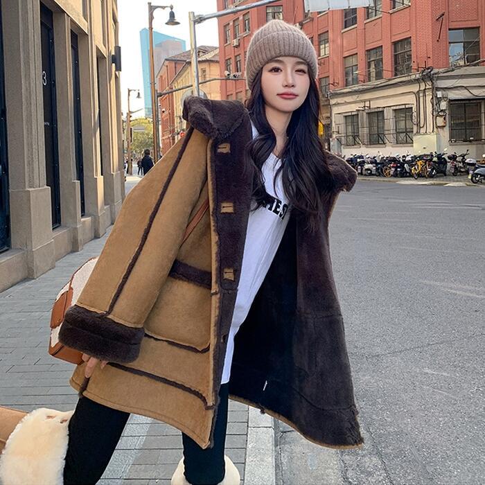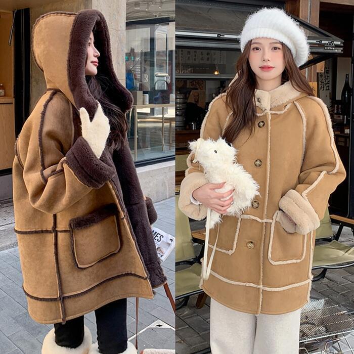 全2種2色 大きいサイズ アウター コート ジャケット スエード ボア 羽織り ブルゾン フード パーカー レディース エレガント 大人 可愛い きれいめ カジュアル フェミニン ミディ丈 暖かい 防寒 ゆったり 体型カバー シンプル ベージュ 春 秋 冬 20代 30代 40代 50代