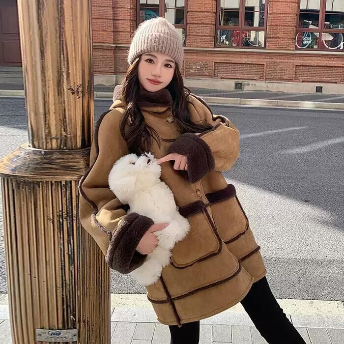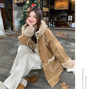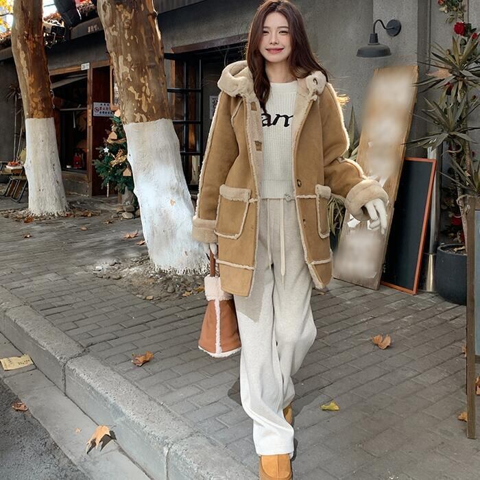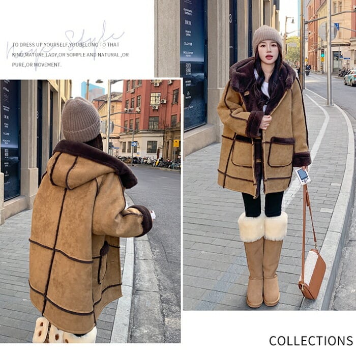 ボアの裏地がしっかり防寒してくれる、フード付きスエードコート。