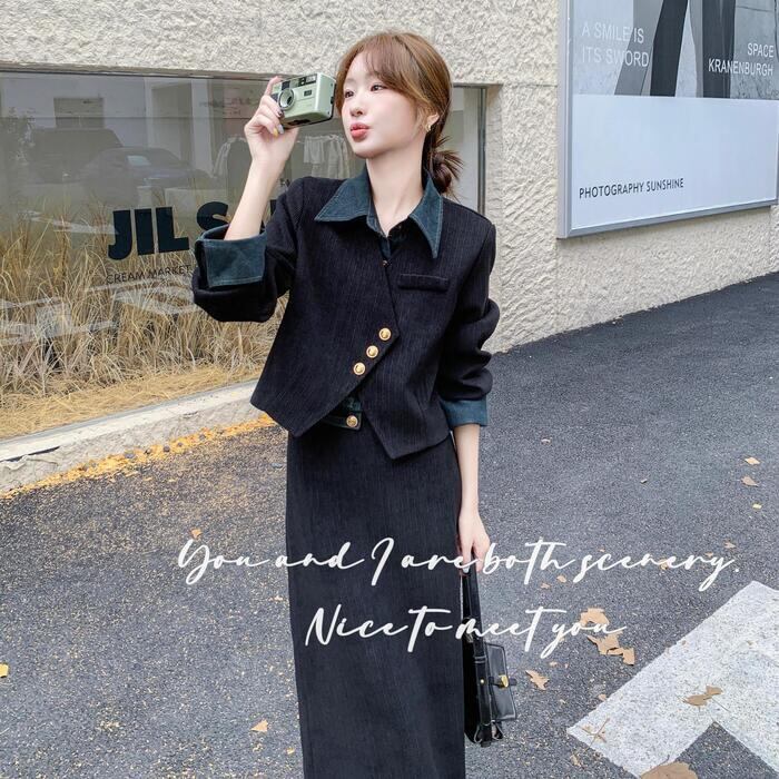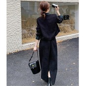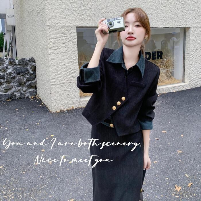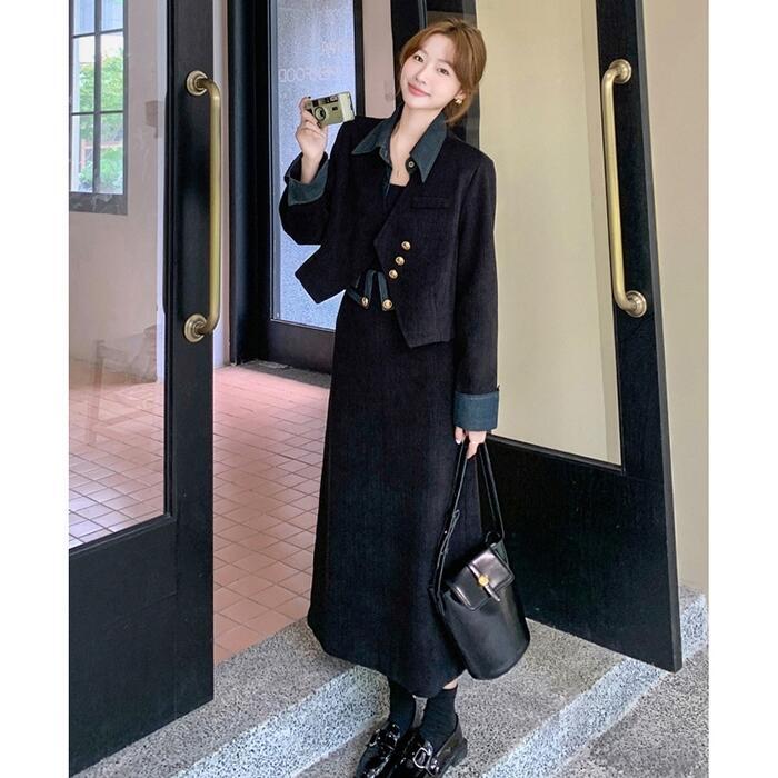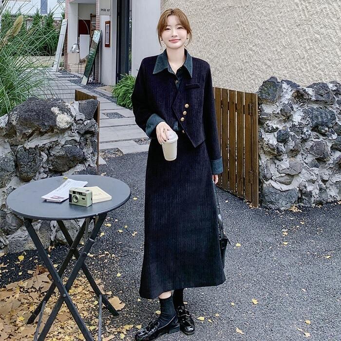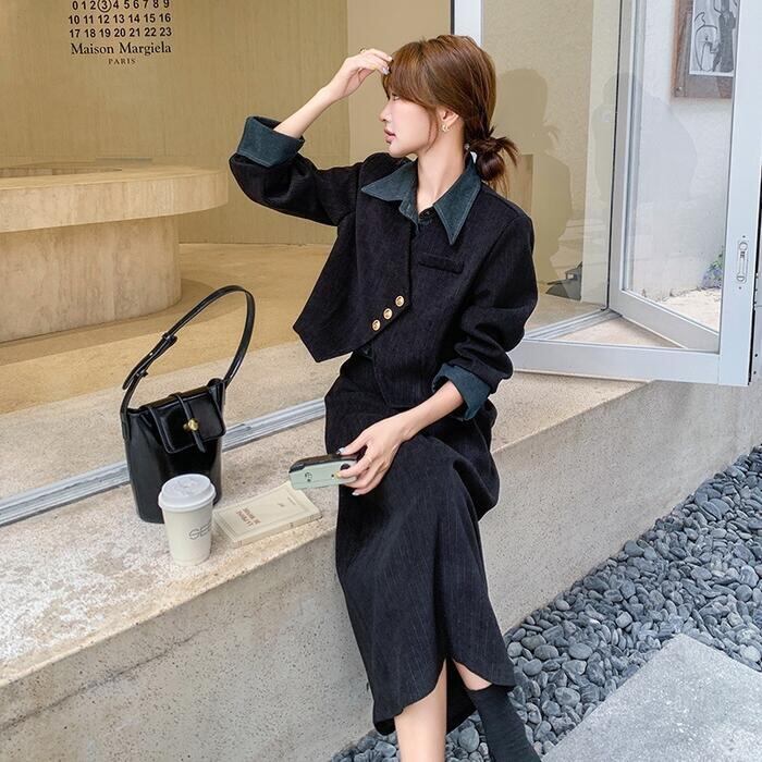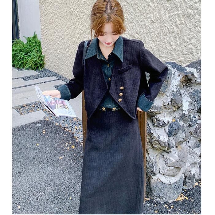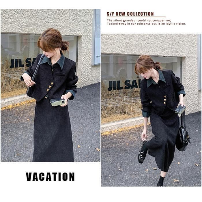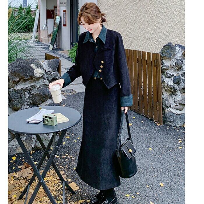 大きいサイズ セットアップ レイヤード風 トップス スカート レディース ジャケット 長袖 2点セット コーデュロイ エレガント きれいめ カジュアル ロング丈 大人 可愛い フェミニン おしゃれ 体型カバー ブラック 黒 春 秋 冬 20代 30代 40代 50代
