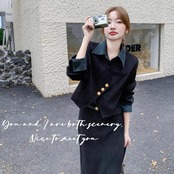 トップスはシャツをドッキングさせたレイヤード風デザイン。