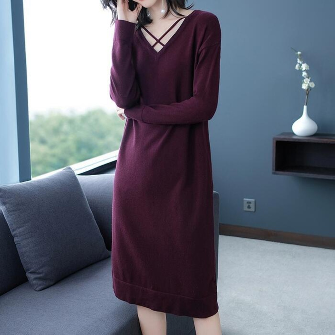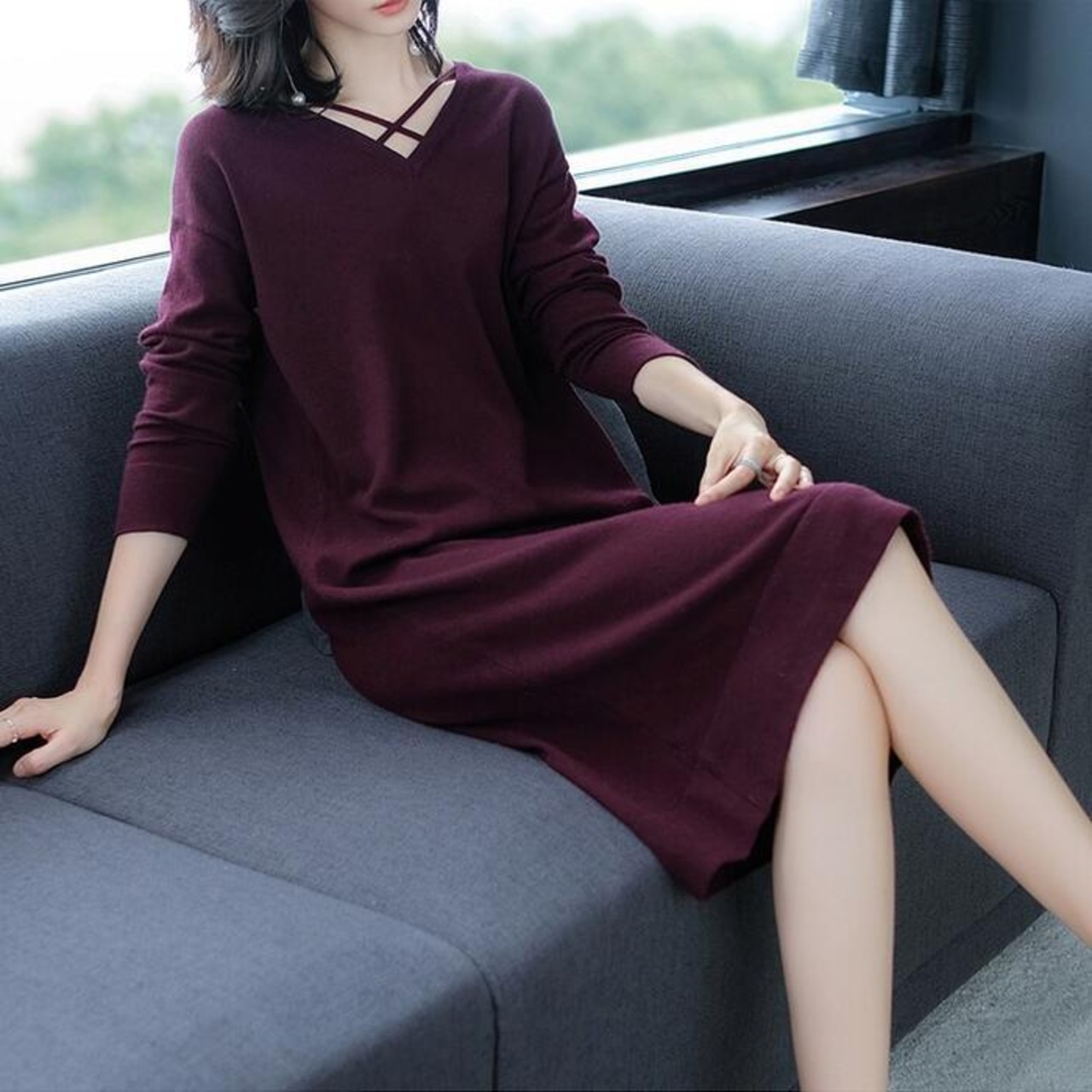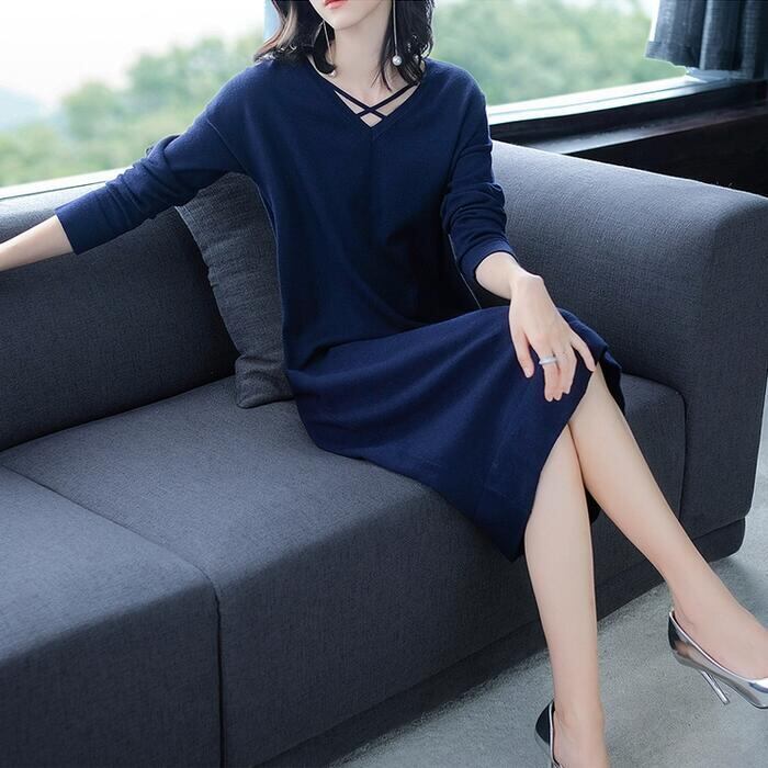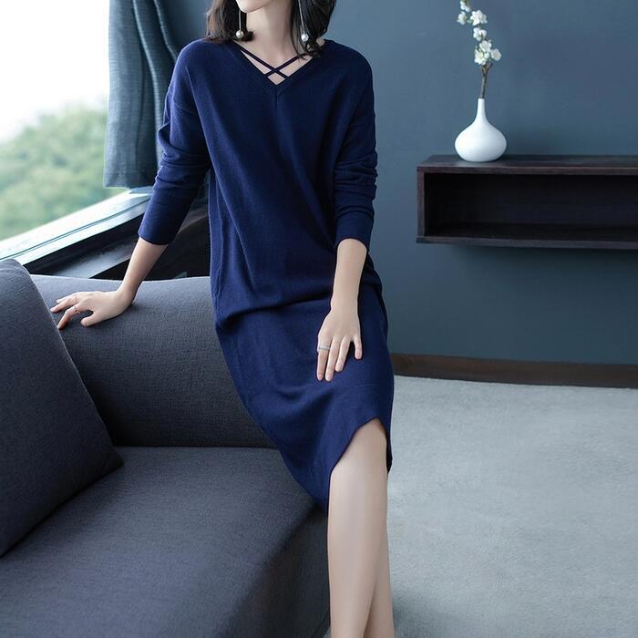 首元のクロスストラップがポイントになったニットワンピース。
