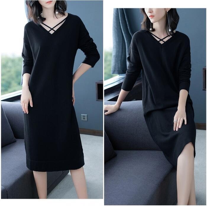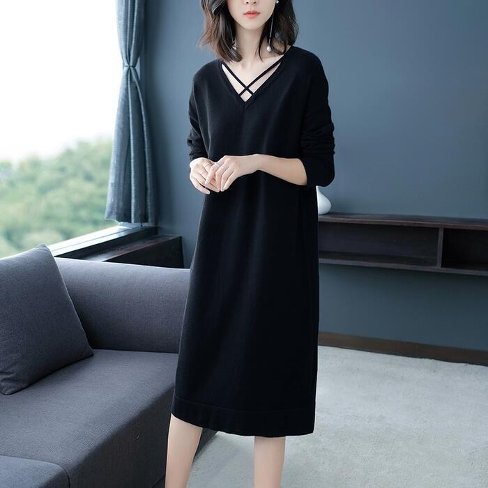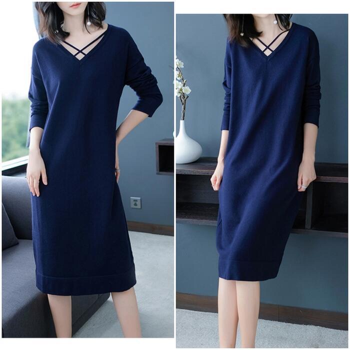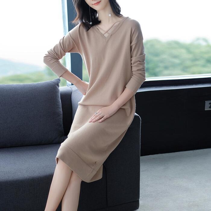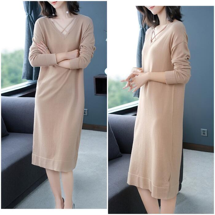 全4色 大きいサイズ 体型カバー ワンピース ワンピ ドレス ニット Vネック レディース エレガント きれいめ カジュアル 大人 可愛い フェミニン 長袖 ひざ丈 シンプル ゆったり ベーシック ナチュラル レッド 赤 ベージュ ネイビー ブラック 黒 春 秋 冬 20代 30代 40代 50代