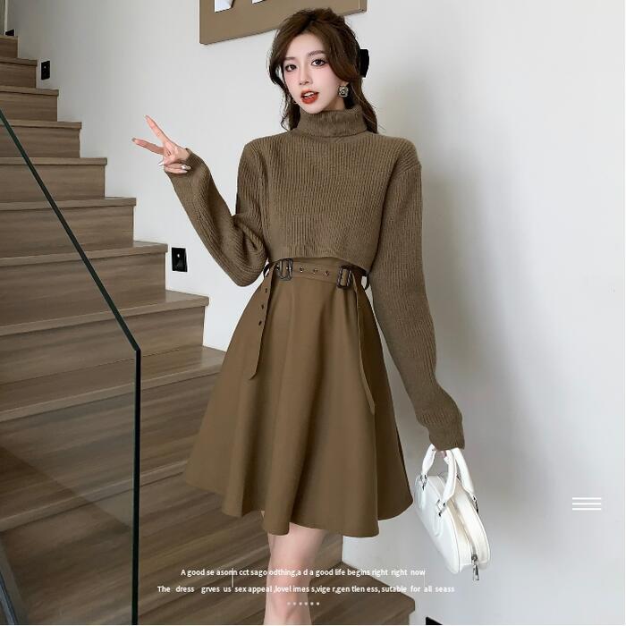 全2色 大きいサイズ 体型カバー 重ね着 おしゃれ レイヤード セットアップ レディース ワンピース ニット セーター タートルネック ハイネック ノースリーブ 長袖 2点セット エレガント カジュアル きれいめ ひざ丈 大人 可愛い フェミニン ブラウン ブラック 黒 春 秋 冬 20代 30代 40代 50代