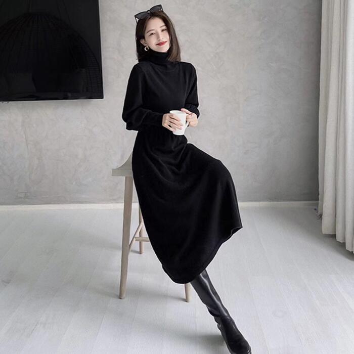 大きいサイズ 体型カバー パフスリーブ ワンピース ワンピ ドレス ニット タートルネック ハイネック レディース エレガント きれいめ カジュアル 大人 可愛い フェミニン 長袖 ミモレ丈 ハイウエスト シンプル ブラック 黒 春 秋 冬 20代 30代 40代 50代