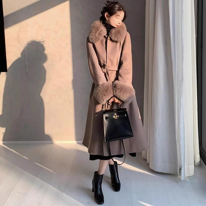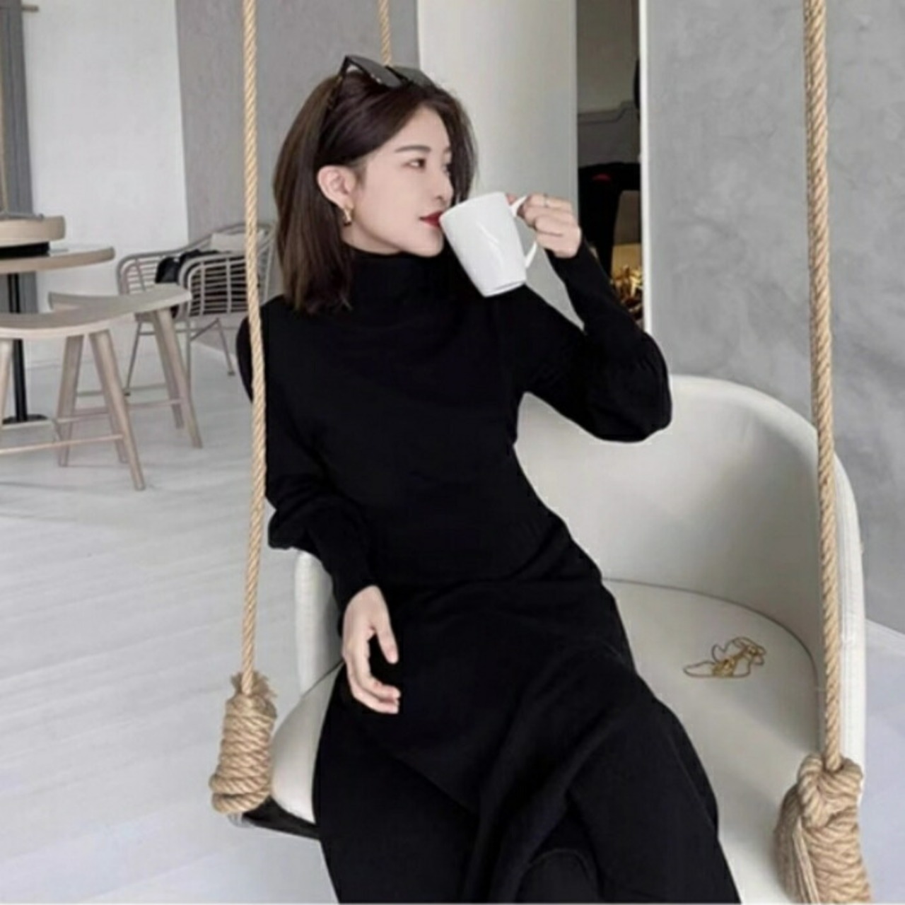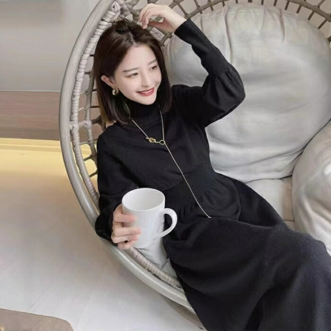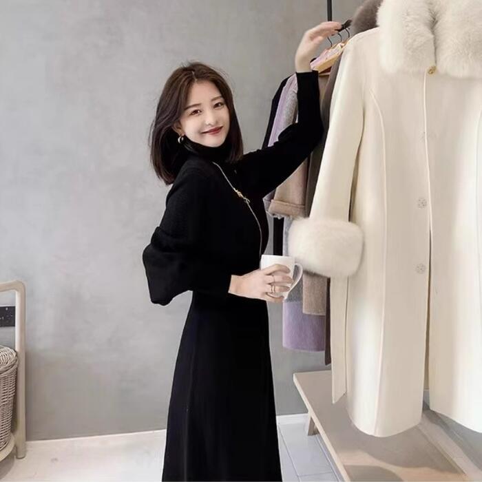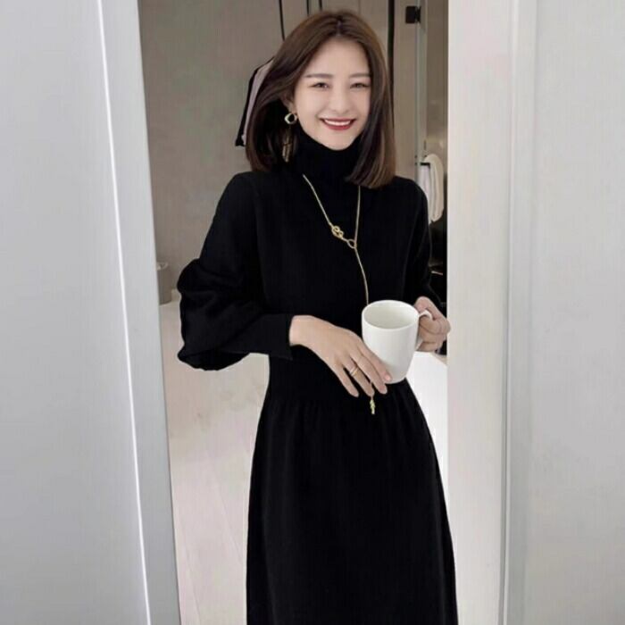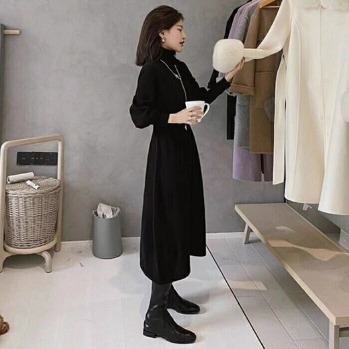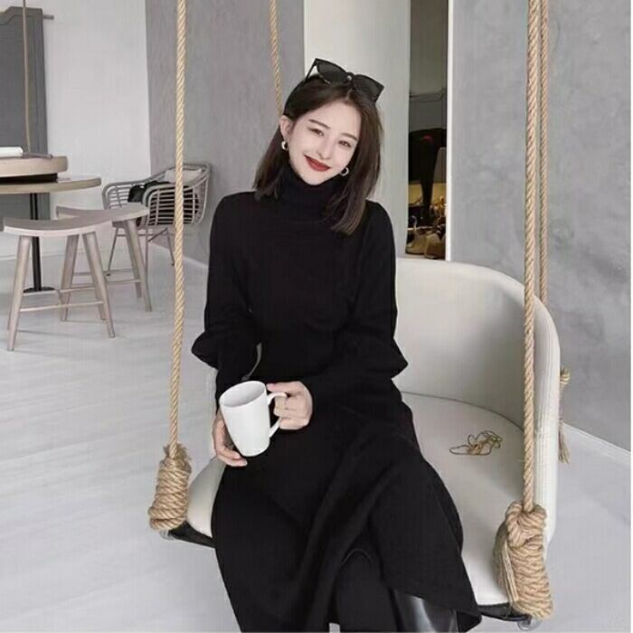 スタイルアップ効果抜群のタートルネックニットワンピース。