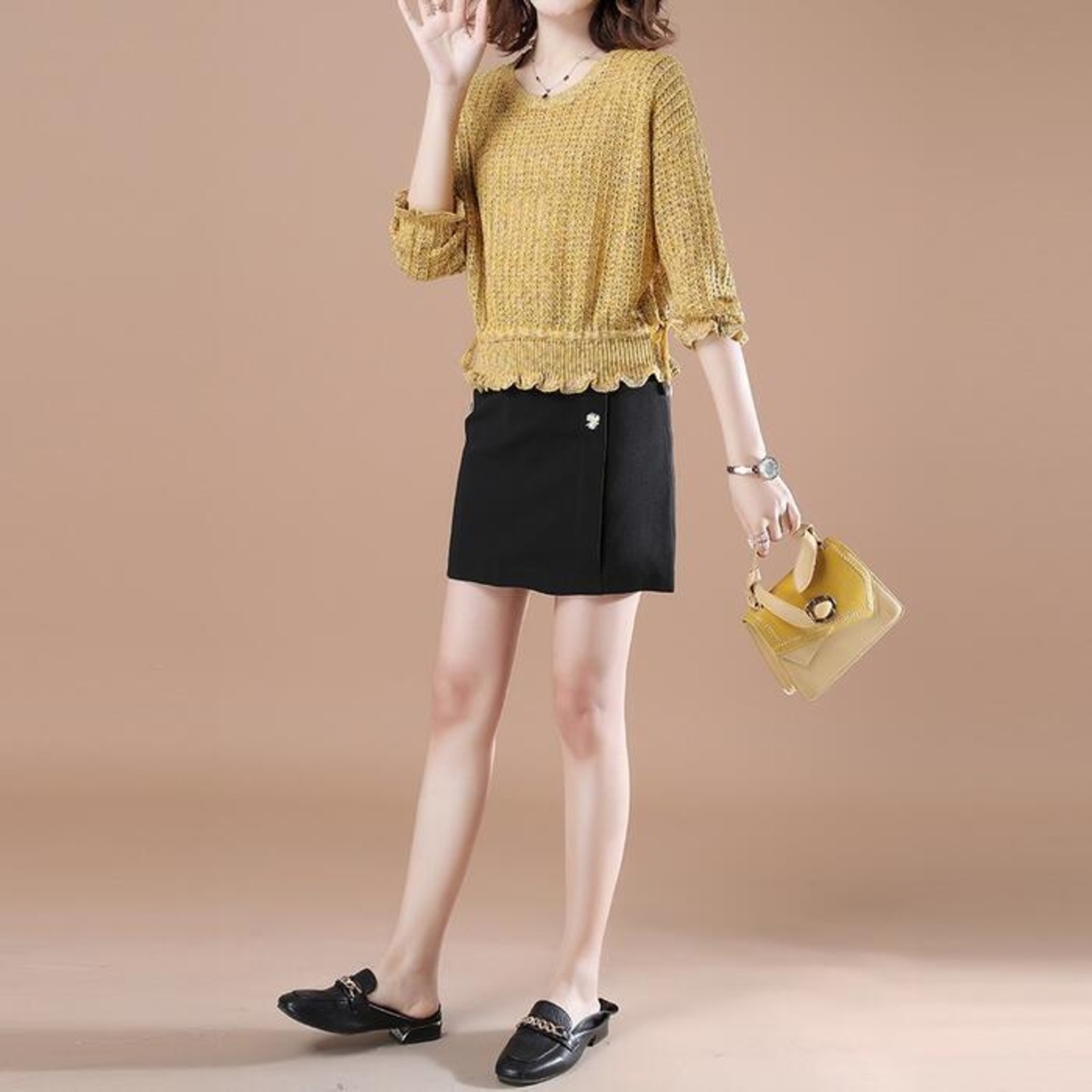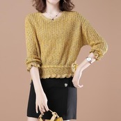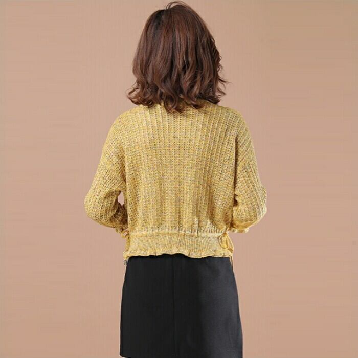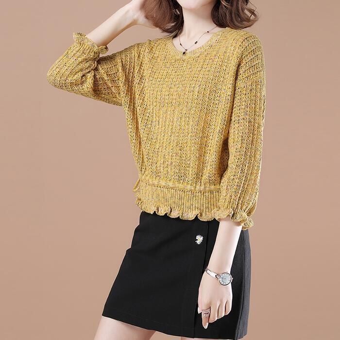 全2色 大きいサイズ 体型カバー トップス ニット セーター カットソー ミックスニット ローゲージ エレガント レディース 大人 可愛い きれいめ カジュアル フェミニン ショート丈 七分袖 ドロスト 透け感 シンプル ベージュ イエロー 春 秋 冬 20代 30代 40代 50代