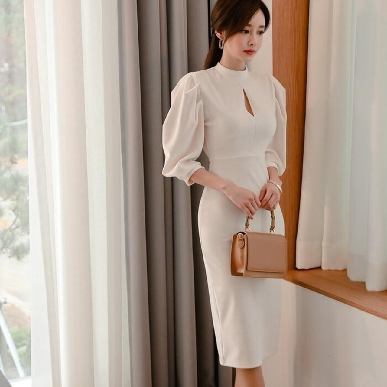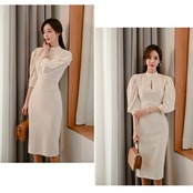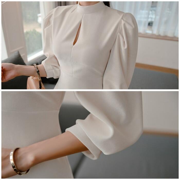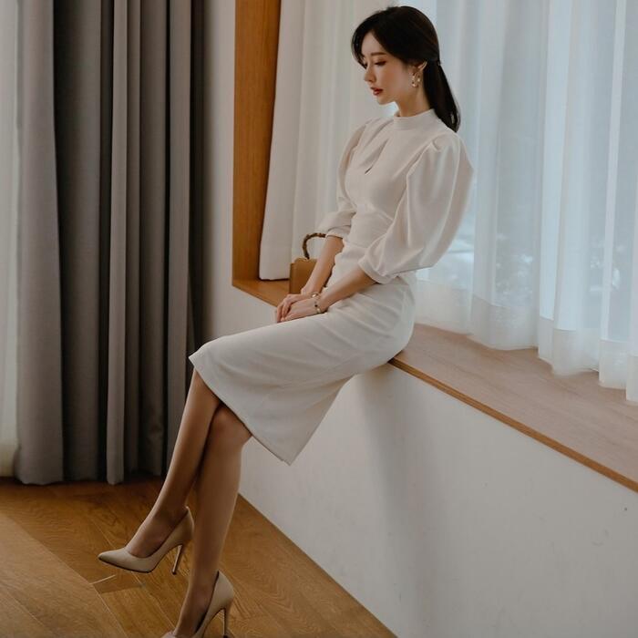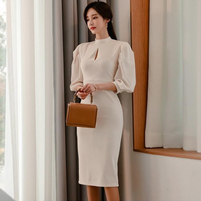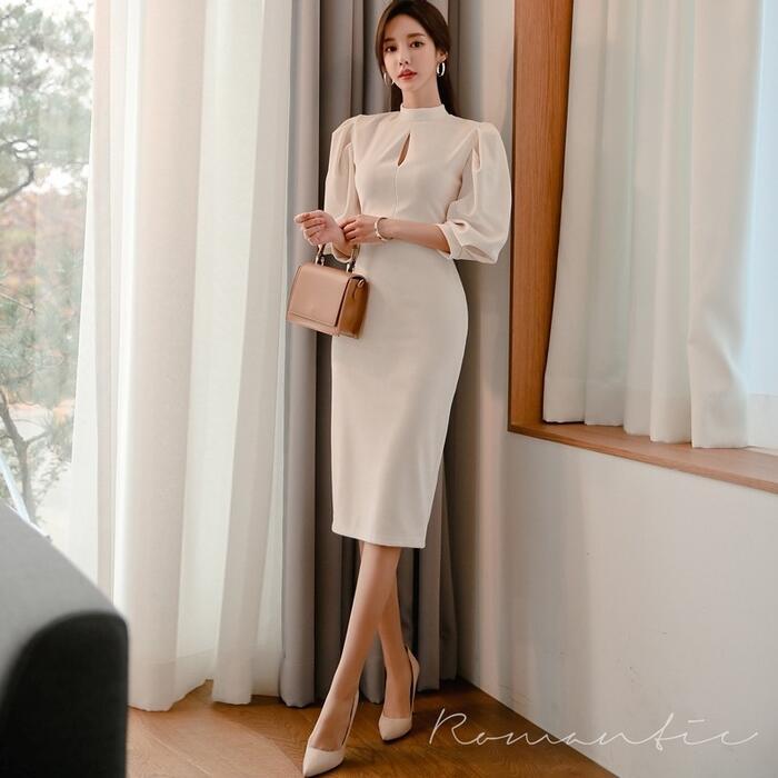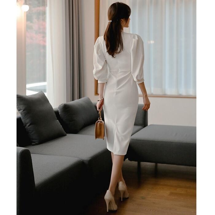 大きいサイズ シンプル スタンドカラー ワンピース ワンピ ドレス パワーショルダー レディース エレガント きれいめ カジュアル 大人 可愛い 七分袖 二次会 フォーマル オケージョン パーティー お呼ばれ ハイウエスト タイト スリム ホワイト 白 春 夏 秋 冬 20代 30代 40代 50代
