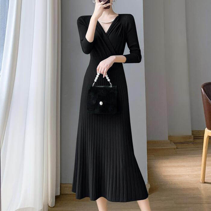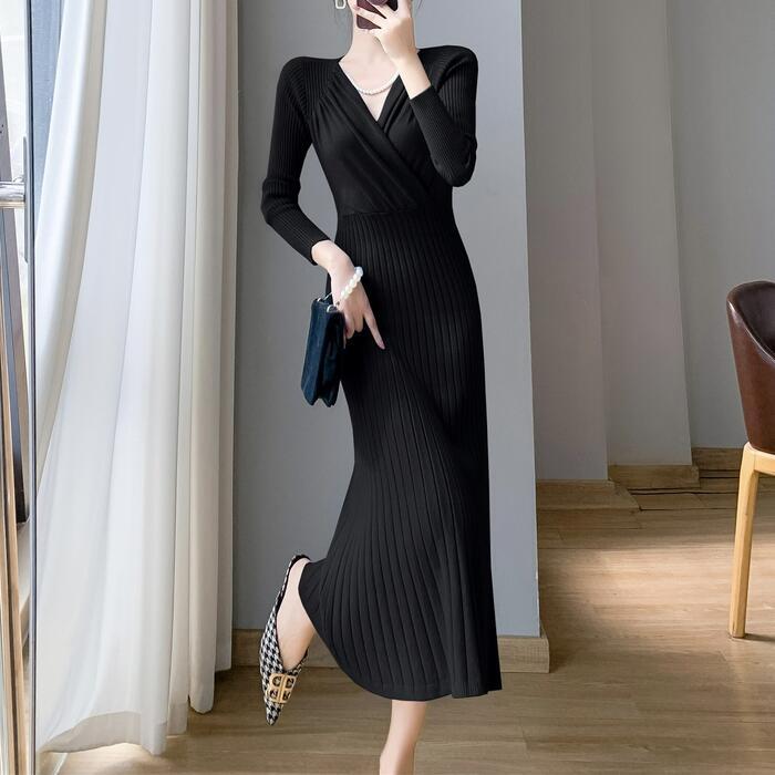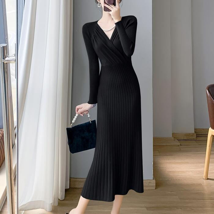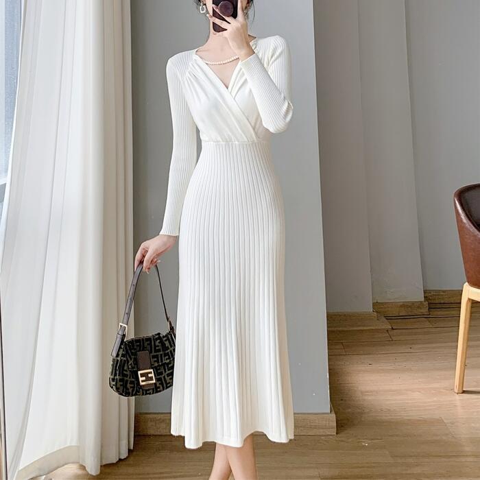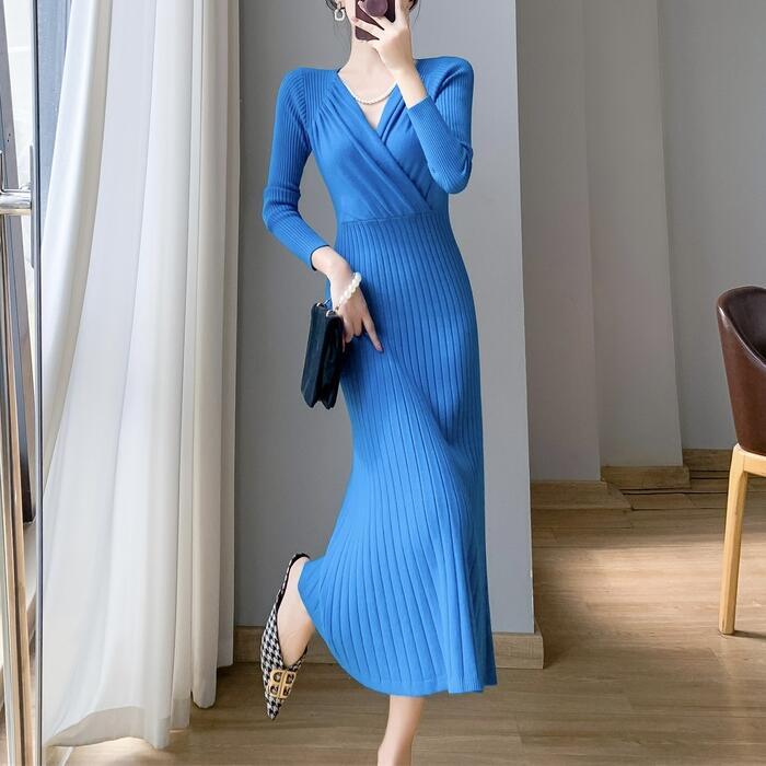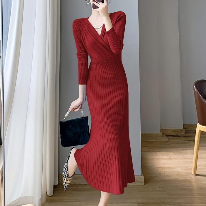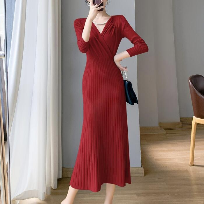 全4色 大きいサイズ 体型カバー フェミニン ワンピース ニット ワンピ ドレス カシュクール Vネック リブ レディース エレガント きれいめ カジュアル 大人 可愛い 長袖 ミモレ丈 切り替え リブ シンプル レッド 赤 ブルー 青 ホワイト 白 ブラック 黒 春 秋 冬 20代 30代 40代 50代