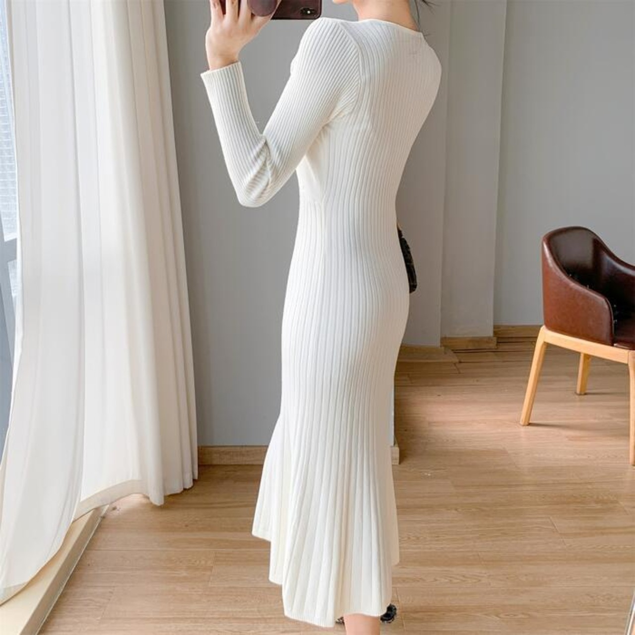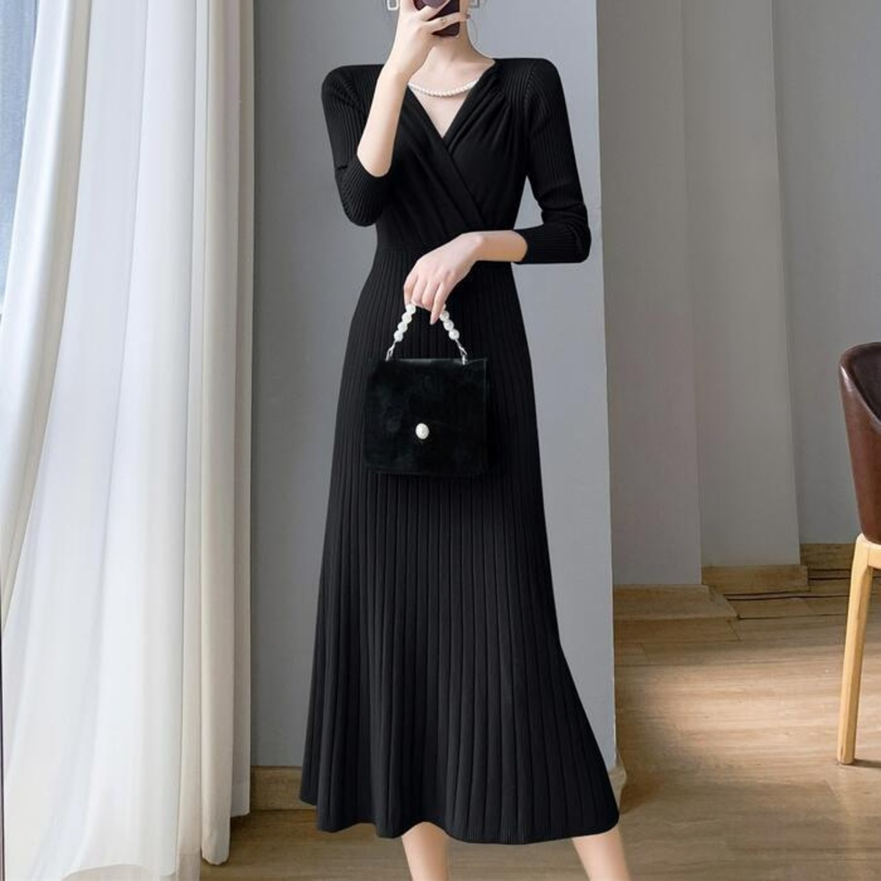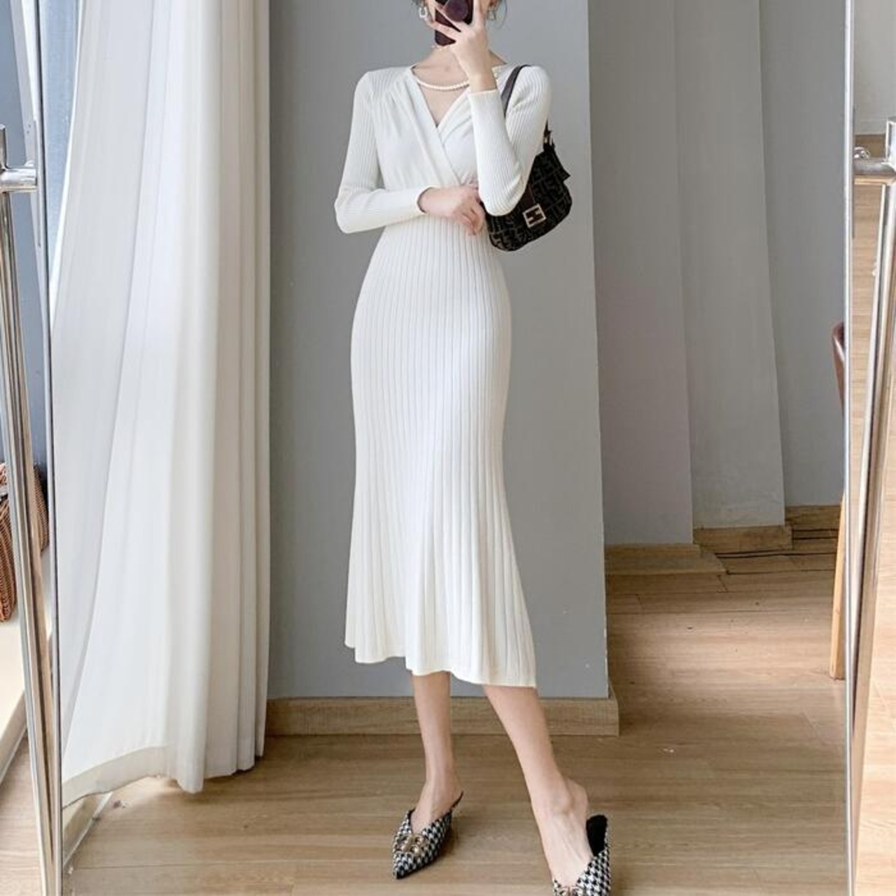 ハイウエストで切り替えたカシュクールニットワンピース。