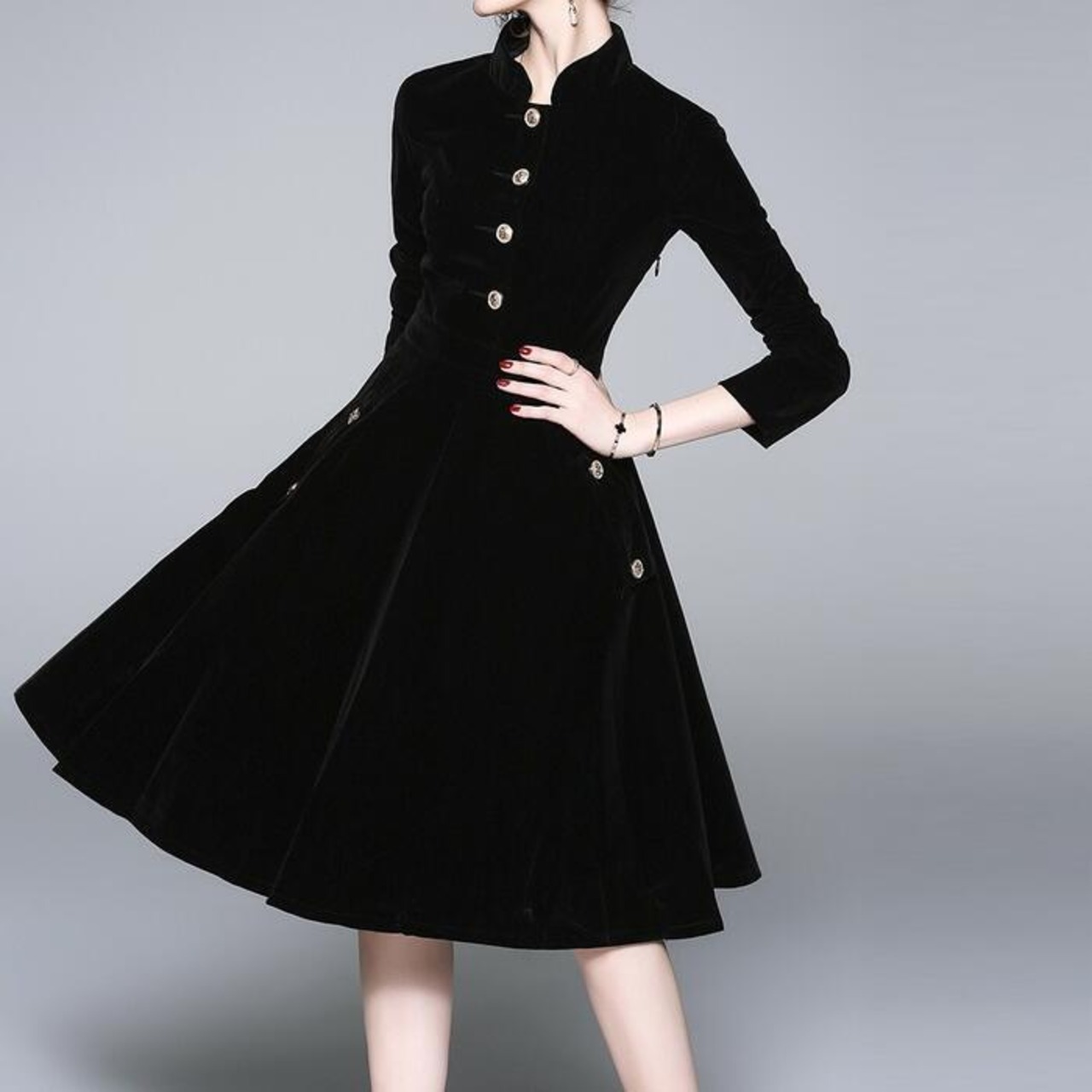 首元はスタンドカラーで上品な印象。