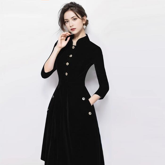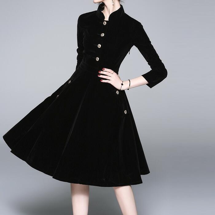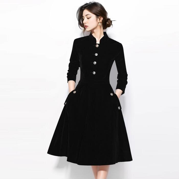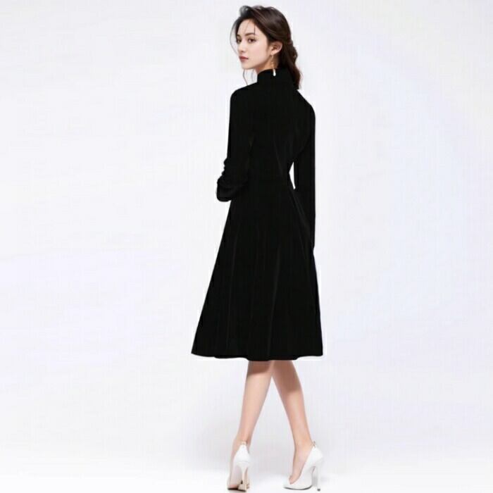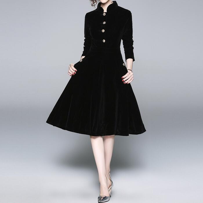 大きいサイズ シンプル ワンピース ワンピ ドレス 袖あり スタンドカラー レディース エレガント きれいめ カジュアル 大人 可愛い 長袖 二次会 オケージョン パーティー お呼ばれ ハイウエスト Aライン ブラック 黒 春 夏 秋 冬 20代 30代 40代 50代