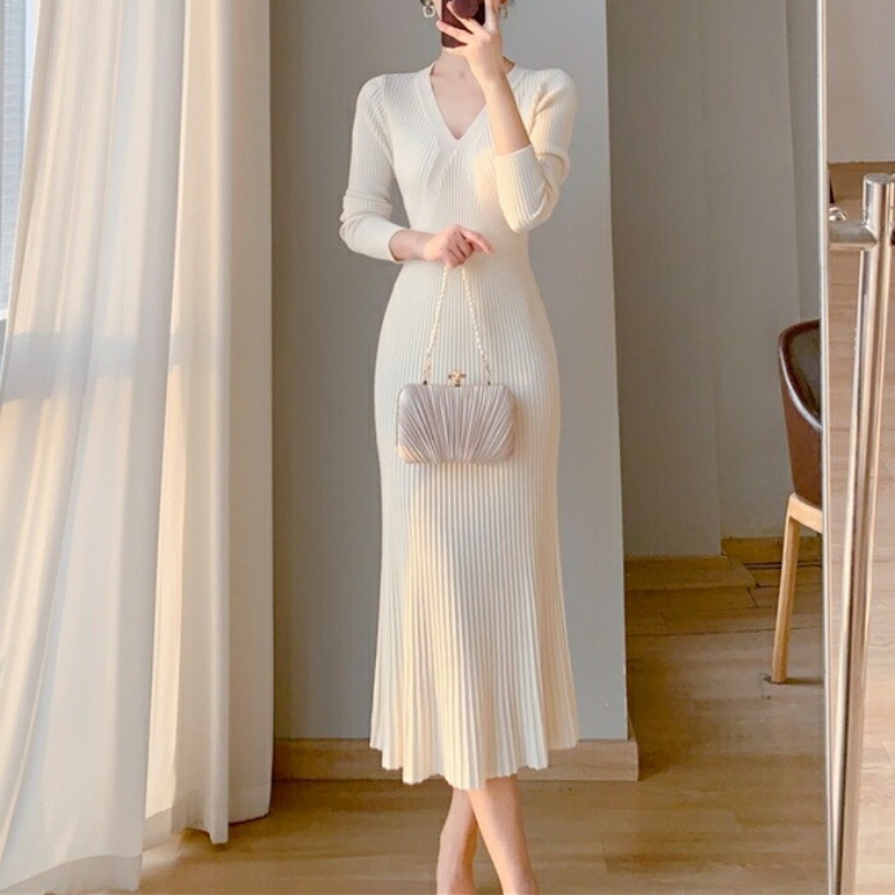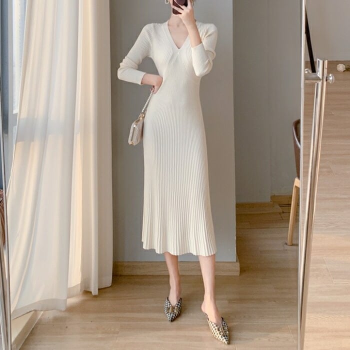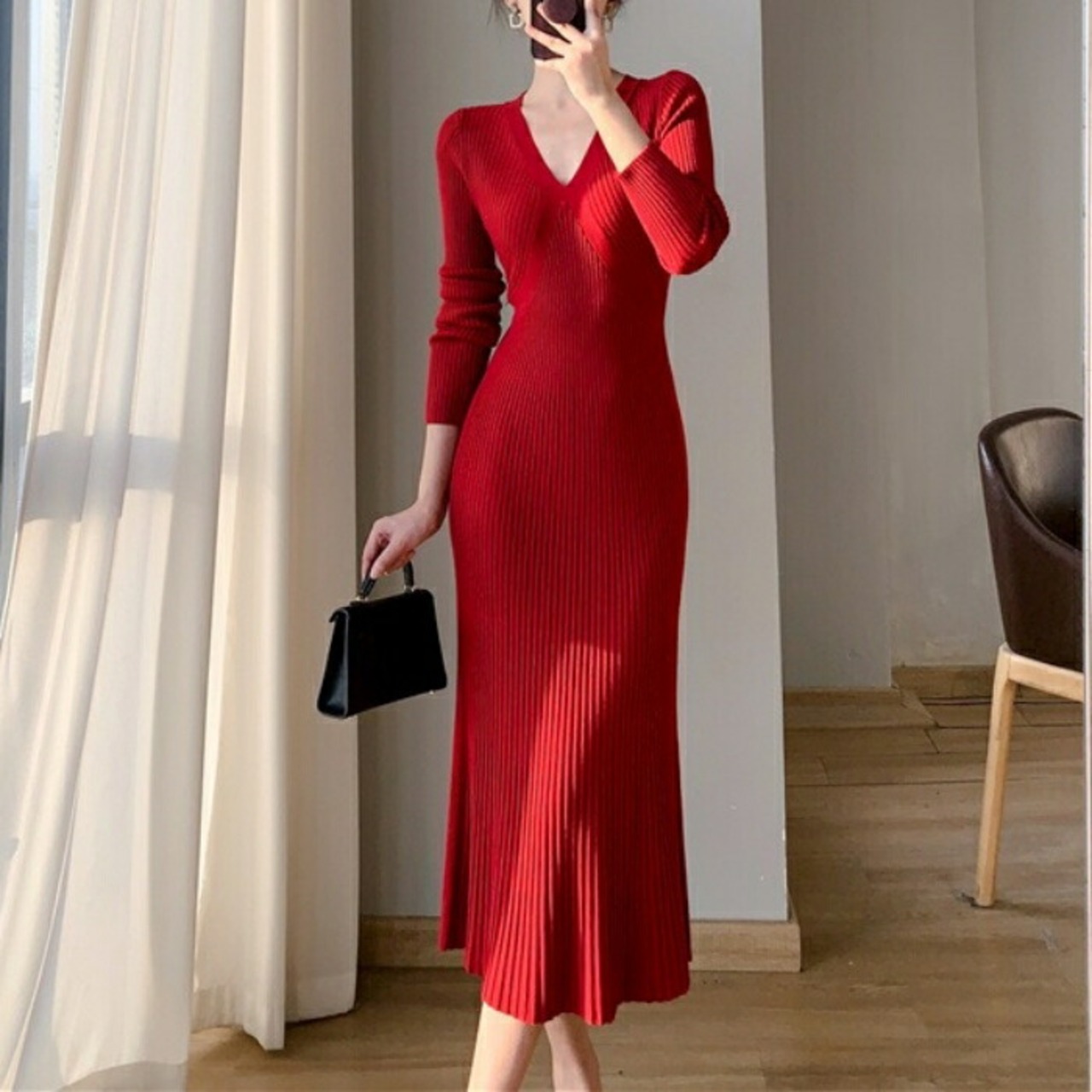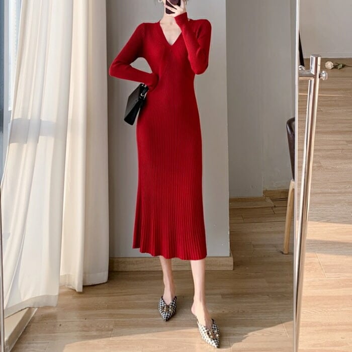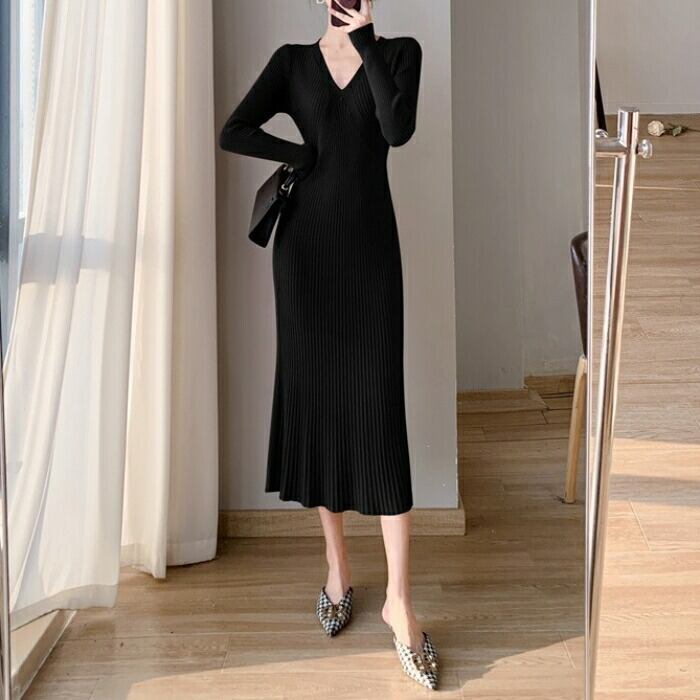 全3色 大きいサイズ 体型カバー ワンピース ニット ワンピ ドレス リブ マーメイド 袖あり レディース エレガント きれいめ カジュアル 大人 可愛い フェミニン 長袖 ミモレ丈 シンプル タイト スリム Vネック ベージュ レッド 赤 ブラック 黒 春 秋 冬 20代 30代 40代 50代