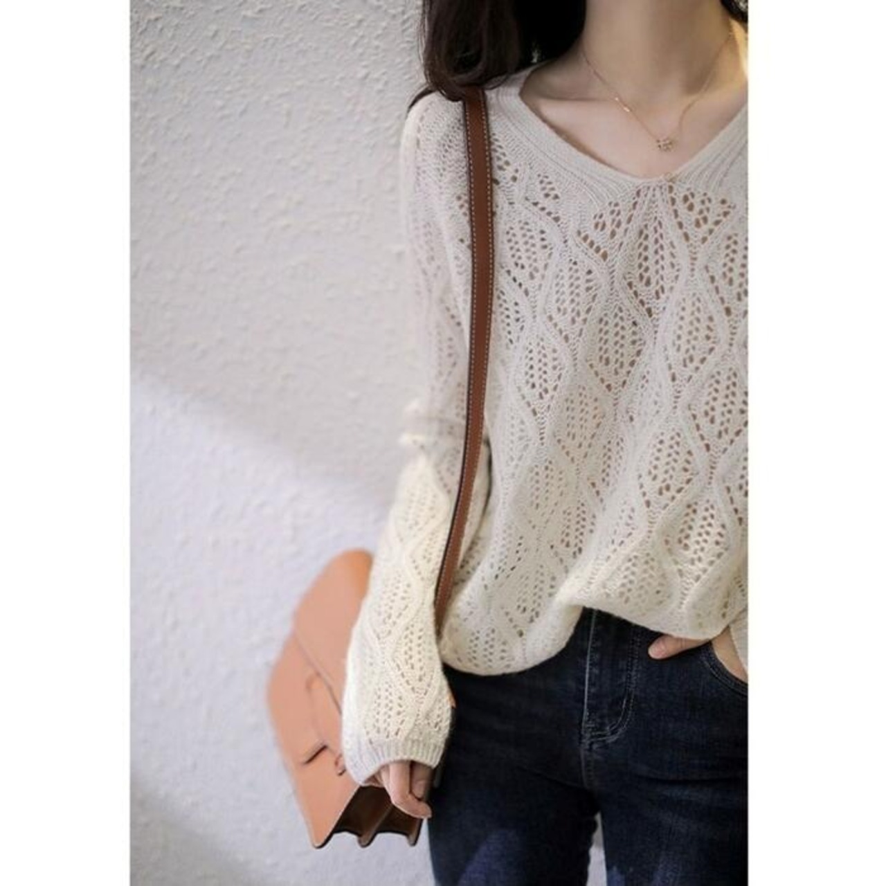 全4色 大きいサイズ 体型カバー トップス ニット カットソー 透かし編み クロシェ セーター エレガント レディース 長袖 きれいめ カジュアル フェミニン 大人 可愛い Vネック シンプル 透け感 イエロー ピンク グリーン 緑 ホワイト 白 春 秋 冬 20代 30代 40代 50代