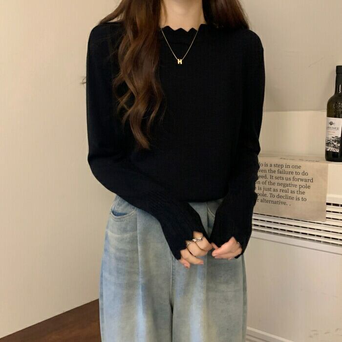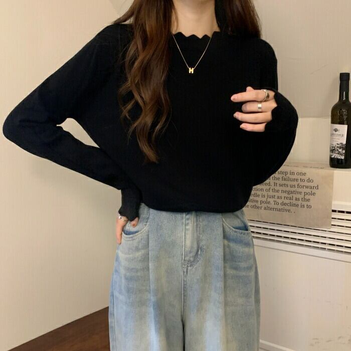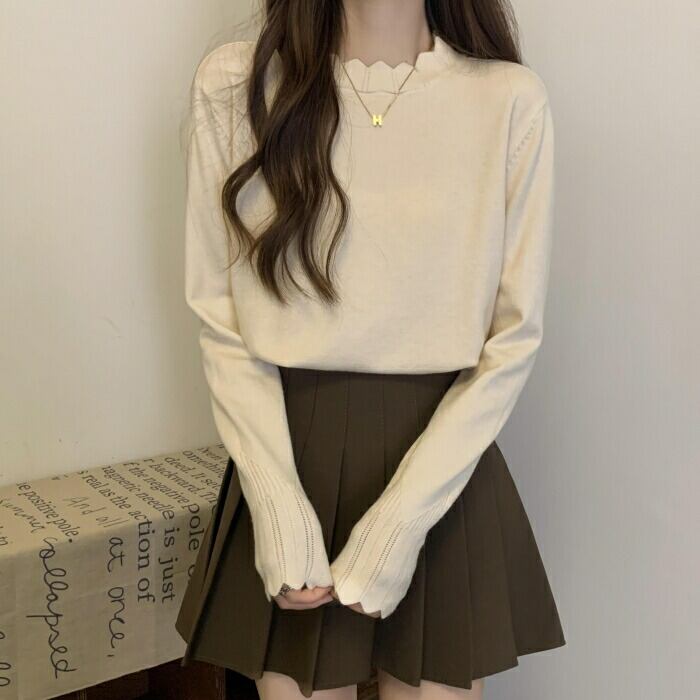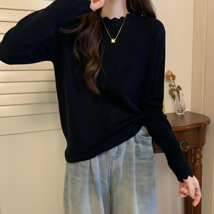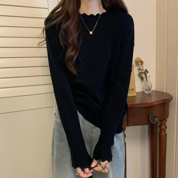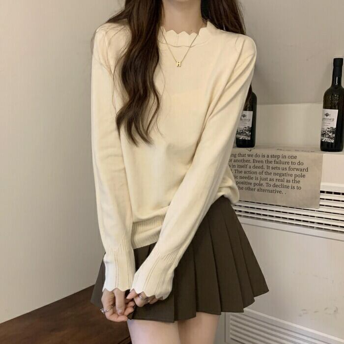 首元と袖口の波型デザインがポイントのニットプルオーバー。