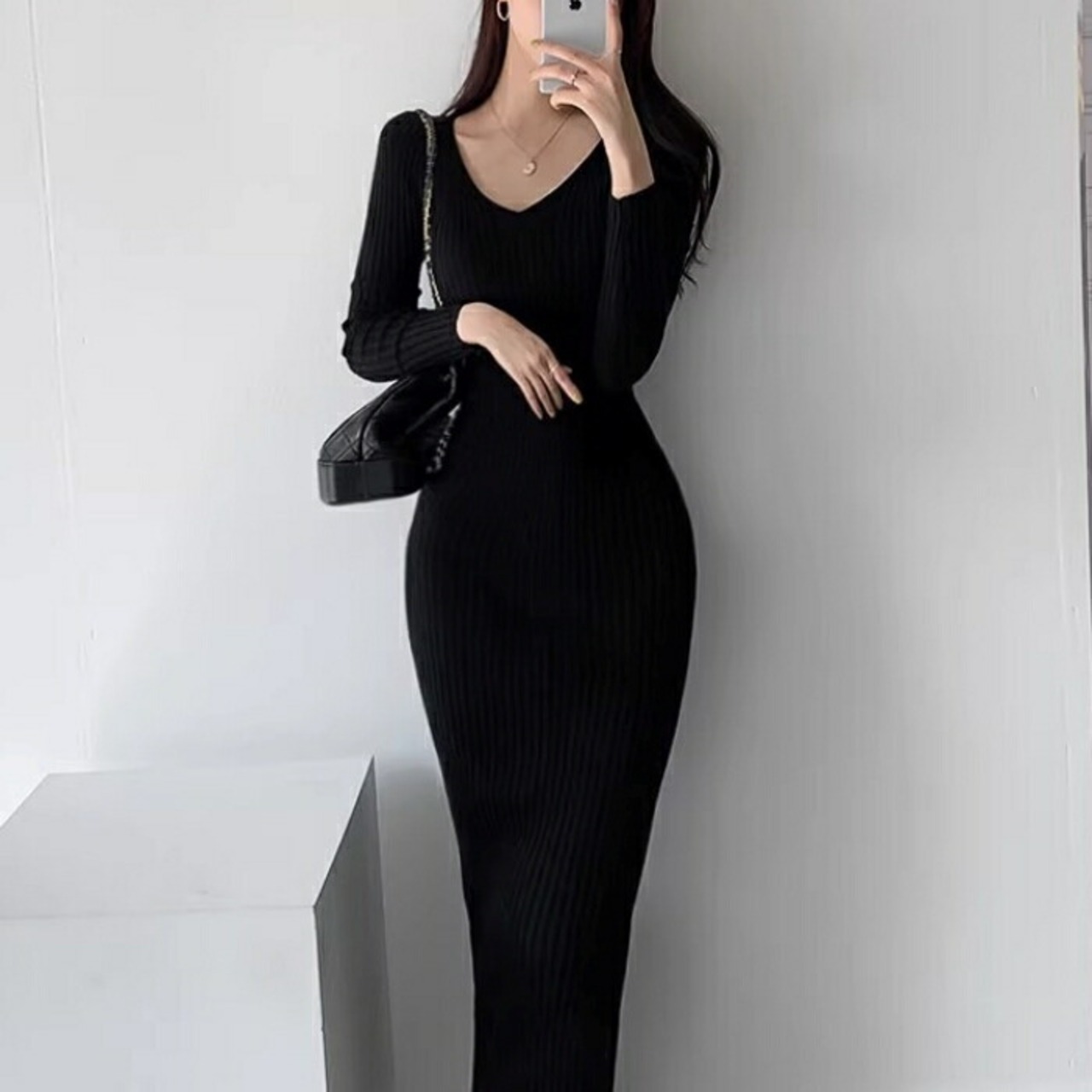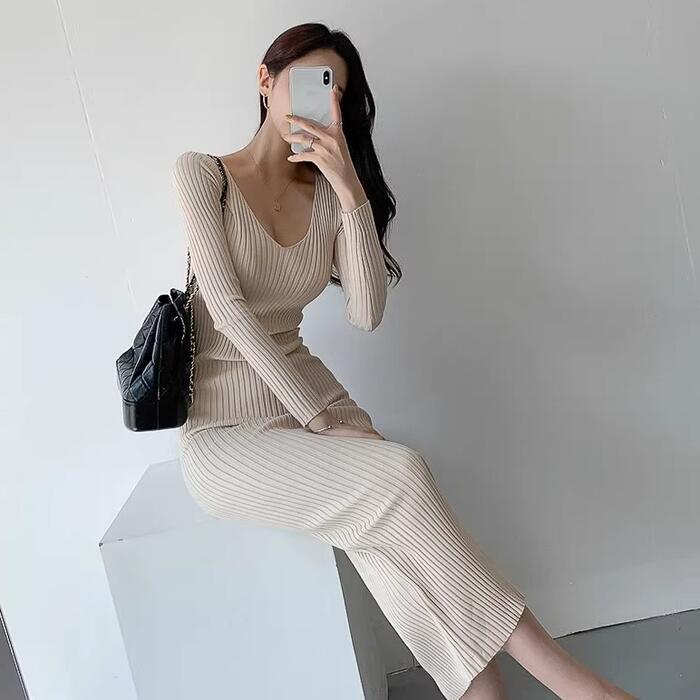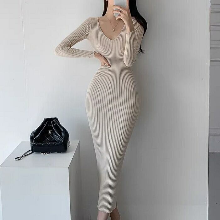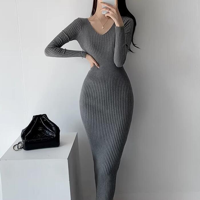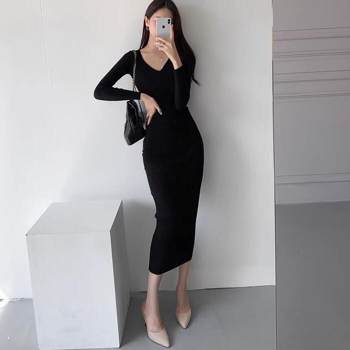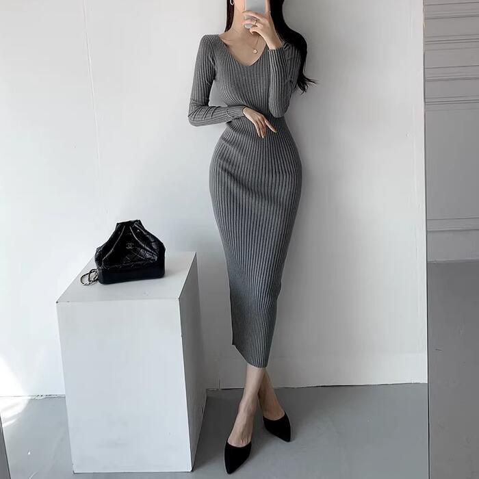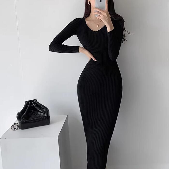 全3色 大きいサイズ 体型カバー ワンピース ニット ワンピ ドレス リブ 袖あり レディース エレガント きれいめ カジュアル 大人 可愛い フェミニン 長袖 ミモレ丈 シンプル タイト スリム Vネック ベージュ グレー ブラック 黒 春 秋 冬 20代 30代 40代 50代