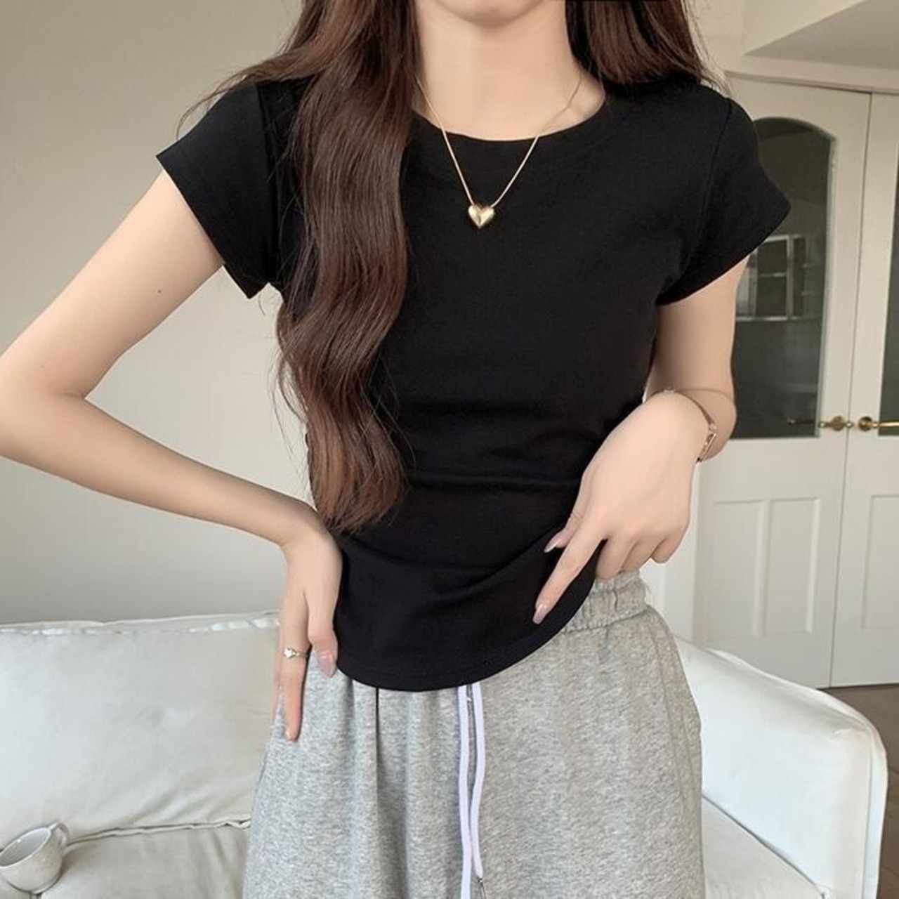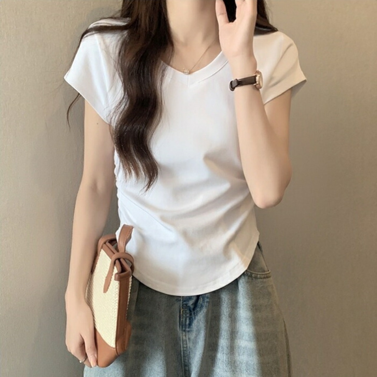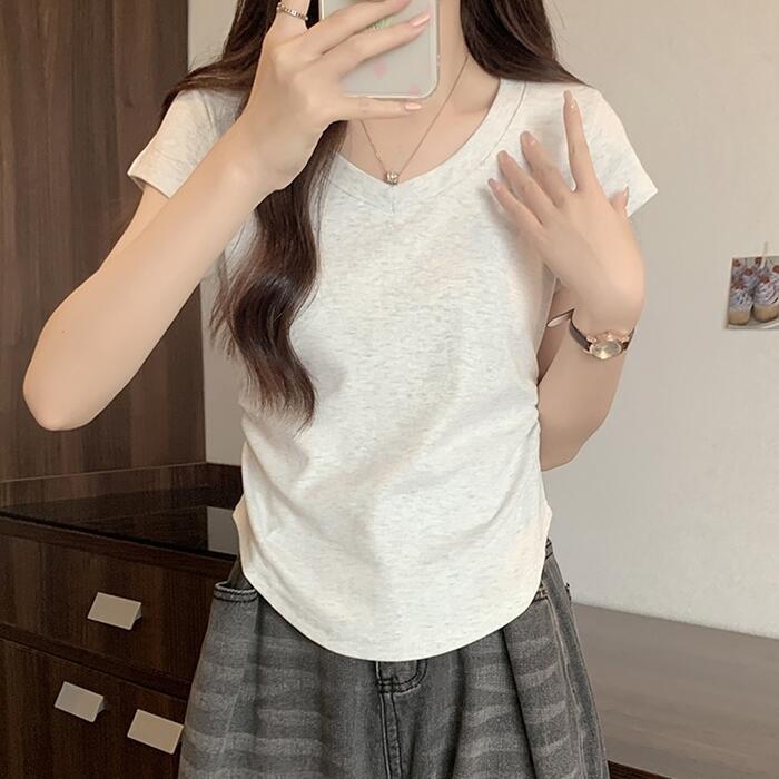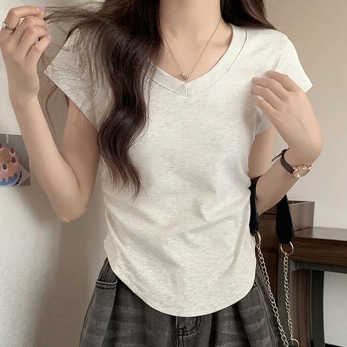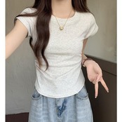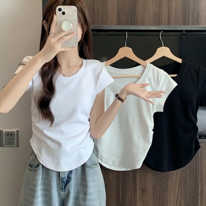 サイドにギャザーを寄せた、ラウンドヘムが女性らしい半袖Tシャツ。