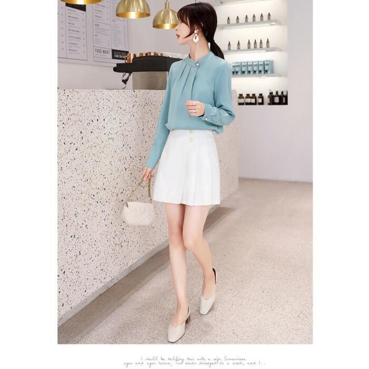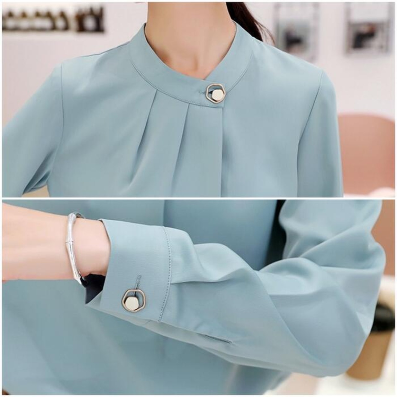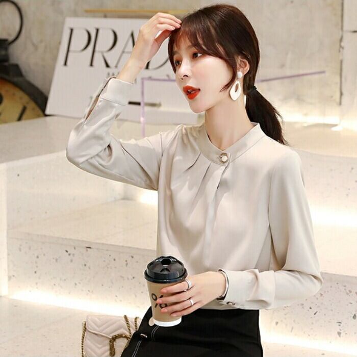 首元のボタンがポイントになったブラウス。
