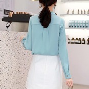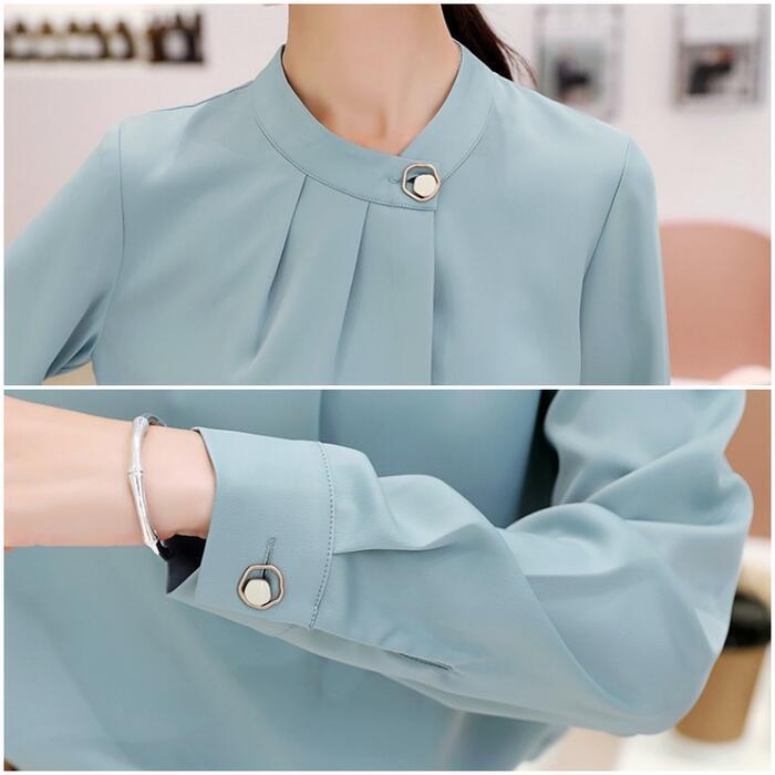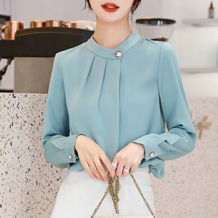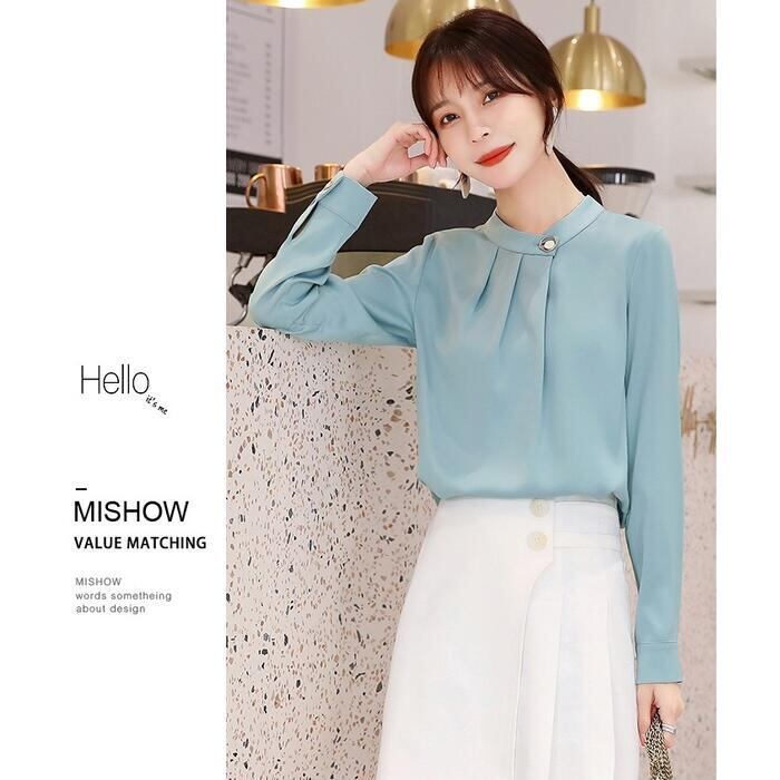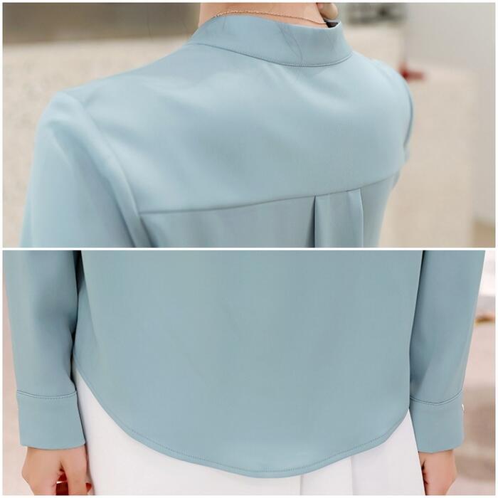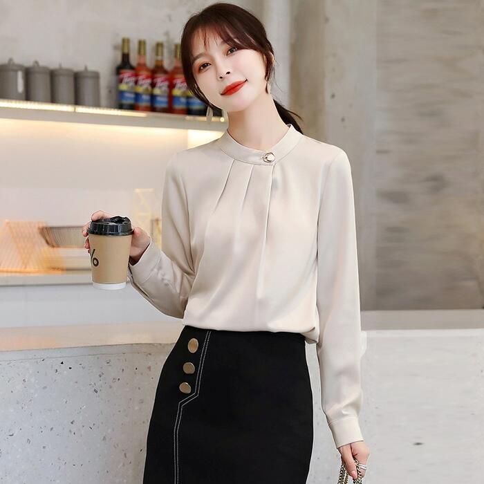 全2色 大きいサイズ 体型カバー トップス シャツ ブラウス シフォン エレガント レディース 大人 可愛い きれいめ カジュアル フェミニン 長袖 シンプル バンドカラー 無地 上品 オケージョン 通勤 オフィス 青 ブルー ベージュ 春 冬 秋 20代 30代 40代 50代