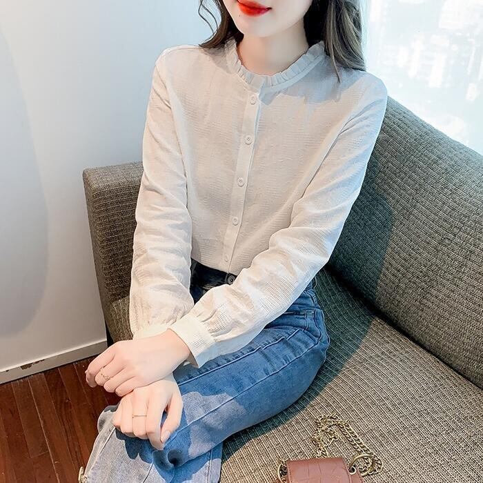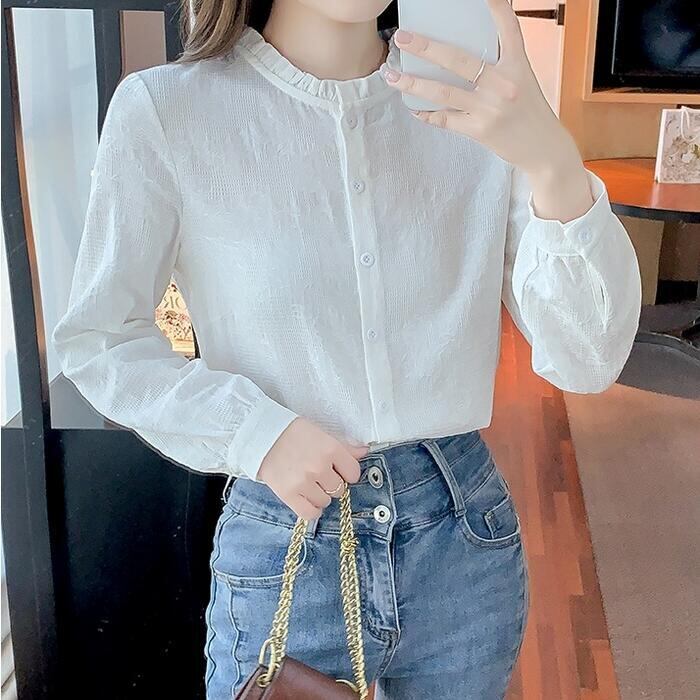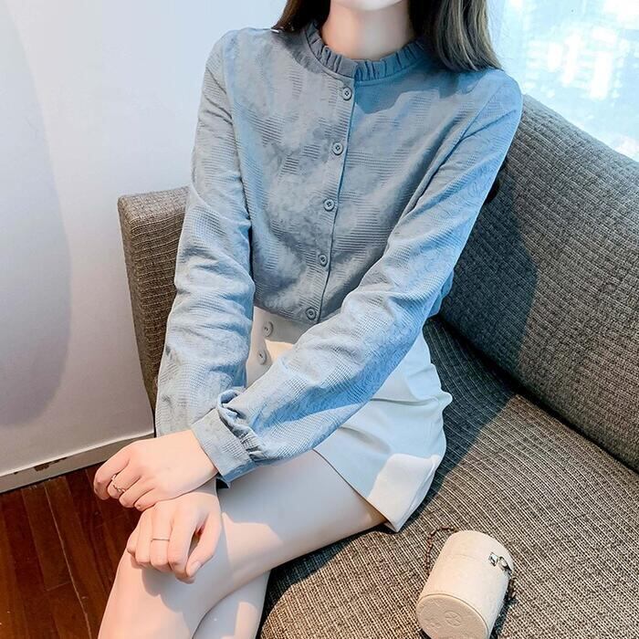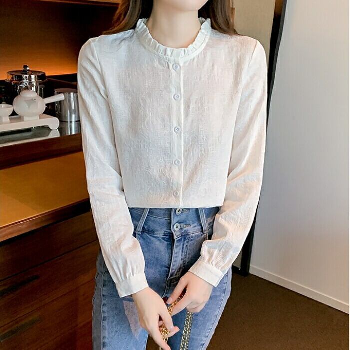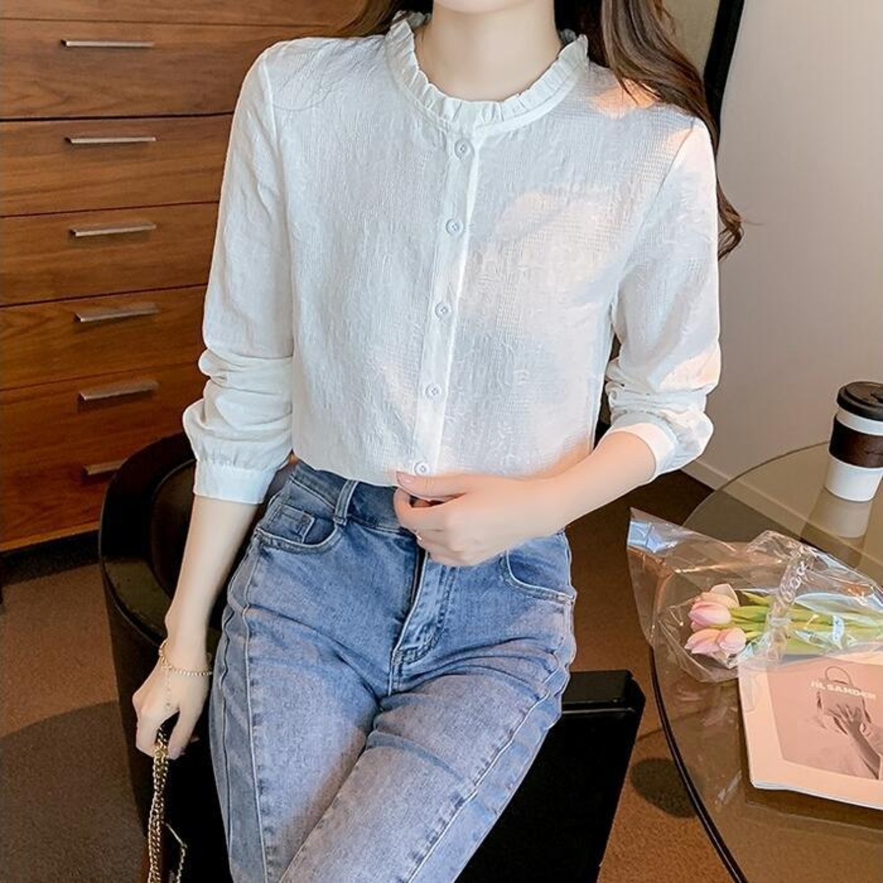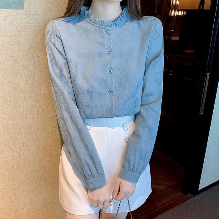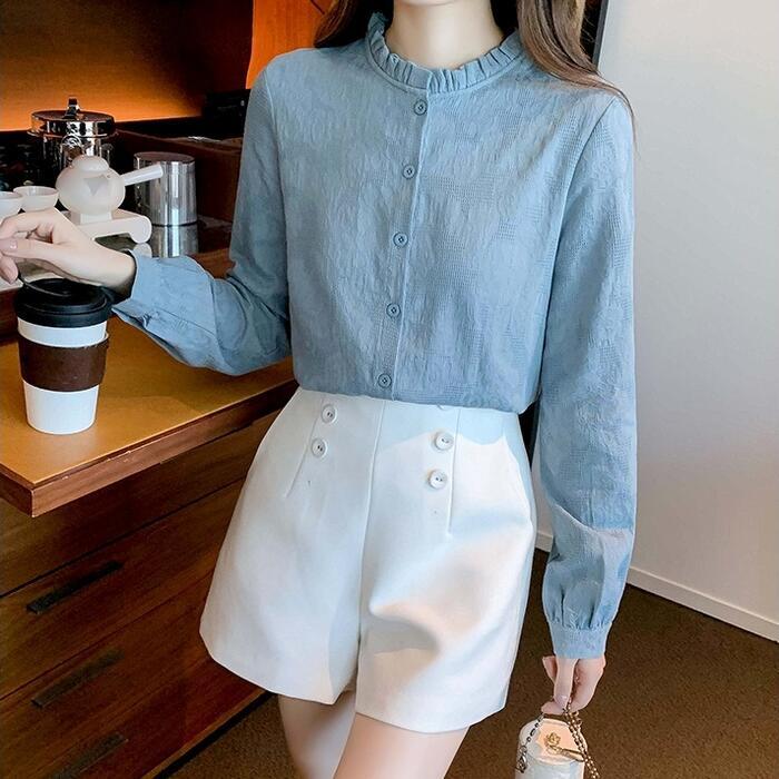 襟のフリルディテールがコーディネートに立体感を与え、シンプルなボトムスと合わせるだけでも上品に決まります。