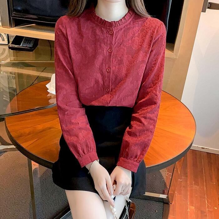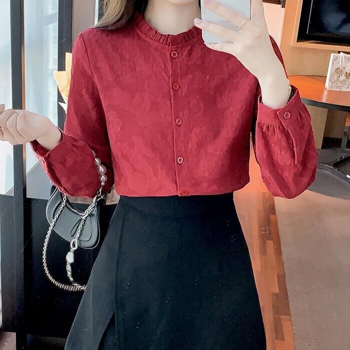 全3色 大きいサイズ 体型カバー トップス シャツ ブラウス フリル コットン エレガント レディース 大人 可愛い きれいめ カジュアル フェミニン 長袖 スタンドカラー 上品 通勤 オフィス ナチュラル レッド 赤 ブルー 青 ホワイト 白 春 冬 秋 20代 30代 40代 50代