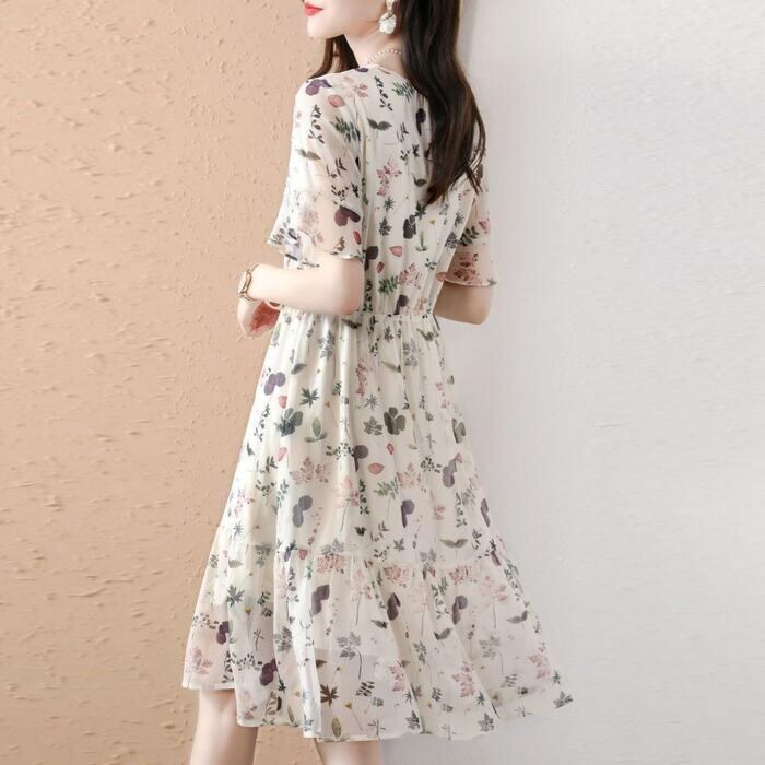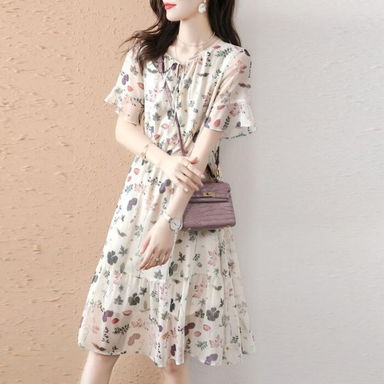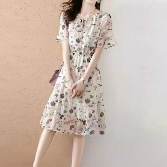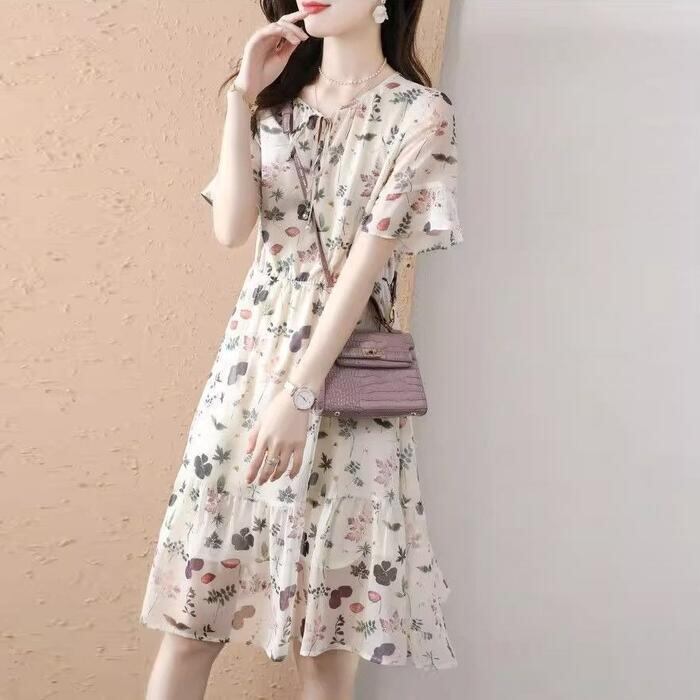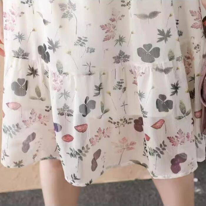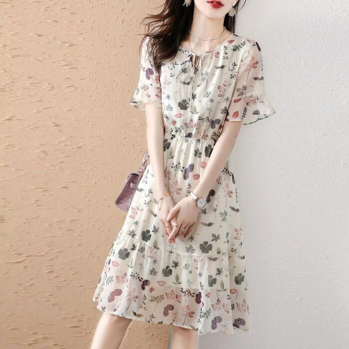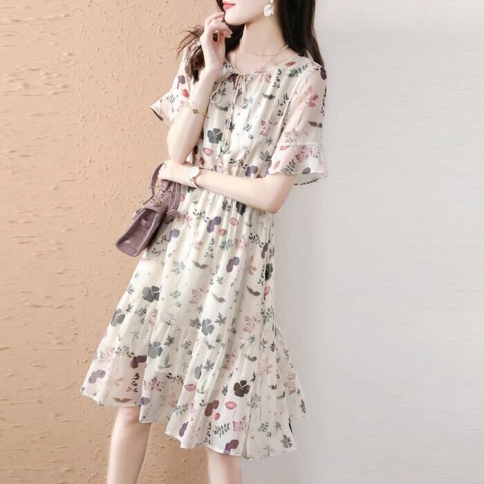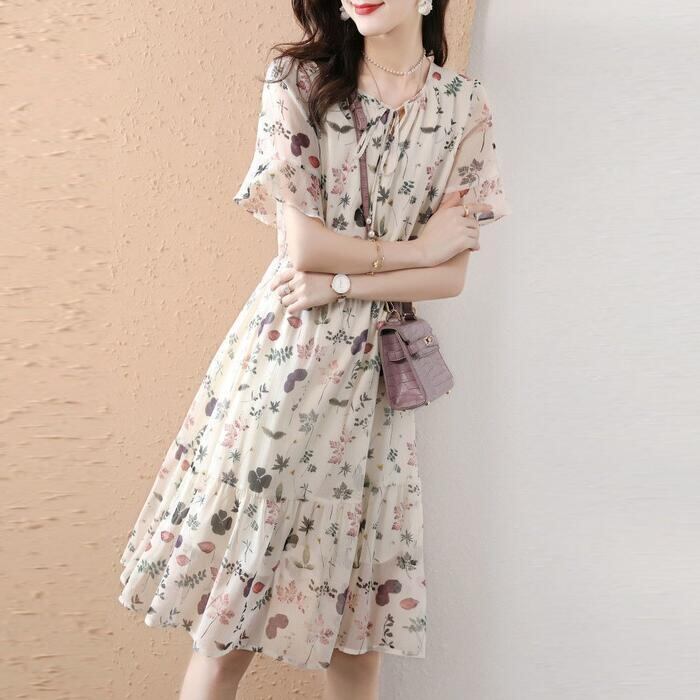 体型カバー ワンピース ワンピ ドレス ボタニカル 花柄 プリント レディース エレガント きれいめ カジュアル 大人 可愛い フェミニン ひざ丈 半袖 リボン リゾート ゆったり リラックス シフォン ナチュラル ベージュ 春 秋 夏 20代 30代 40代 50代