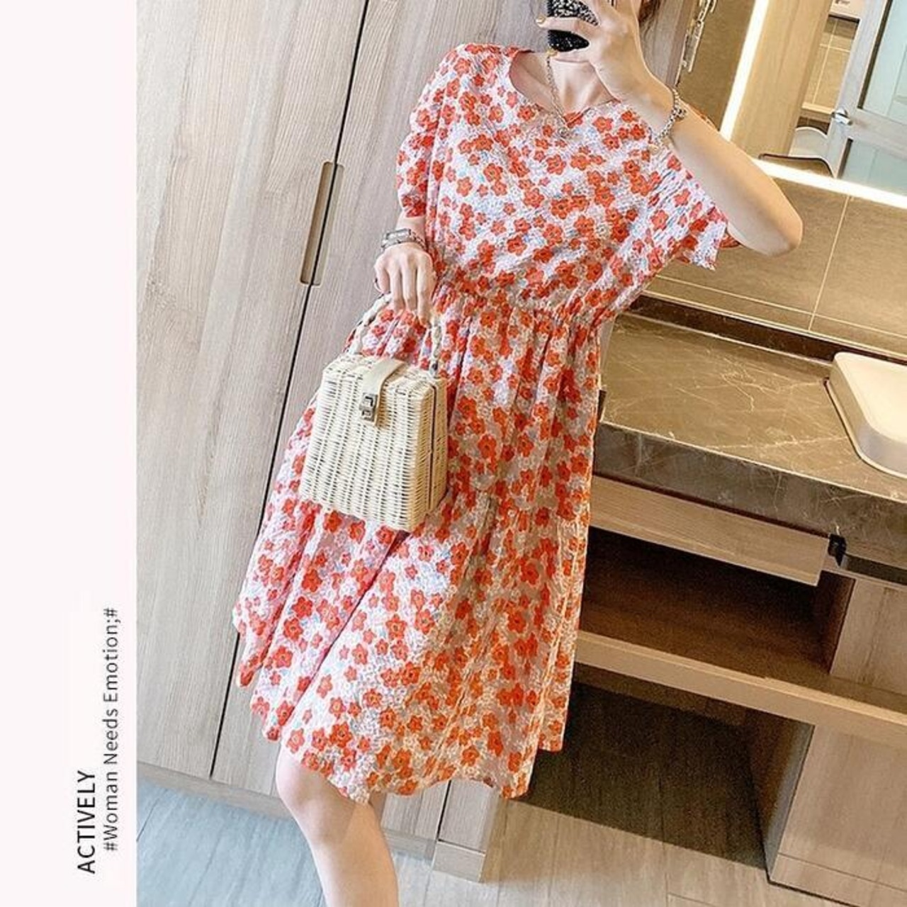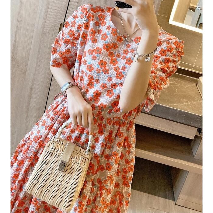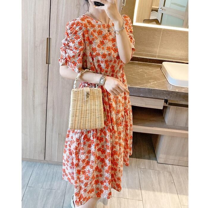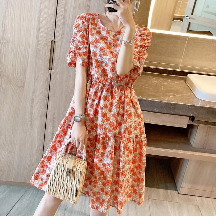 体型カバー ティアード ワンピース ワンピ ドレス ボタニカル 花柄 プリント レディース エレガント きれいめ カジュアル 大人 可愛い フェミニン ひざ丈 半袖 レトロ クラシカル ゆったり リラックス シフォン オレンジ 春 秋 夏 20代 30代 40代 50代