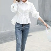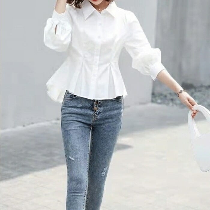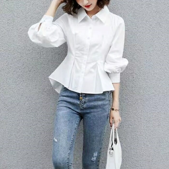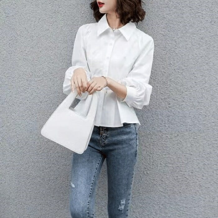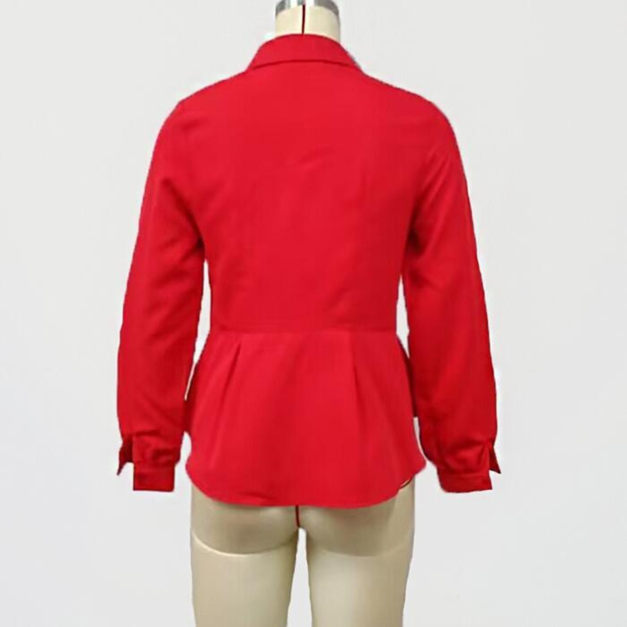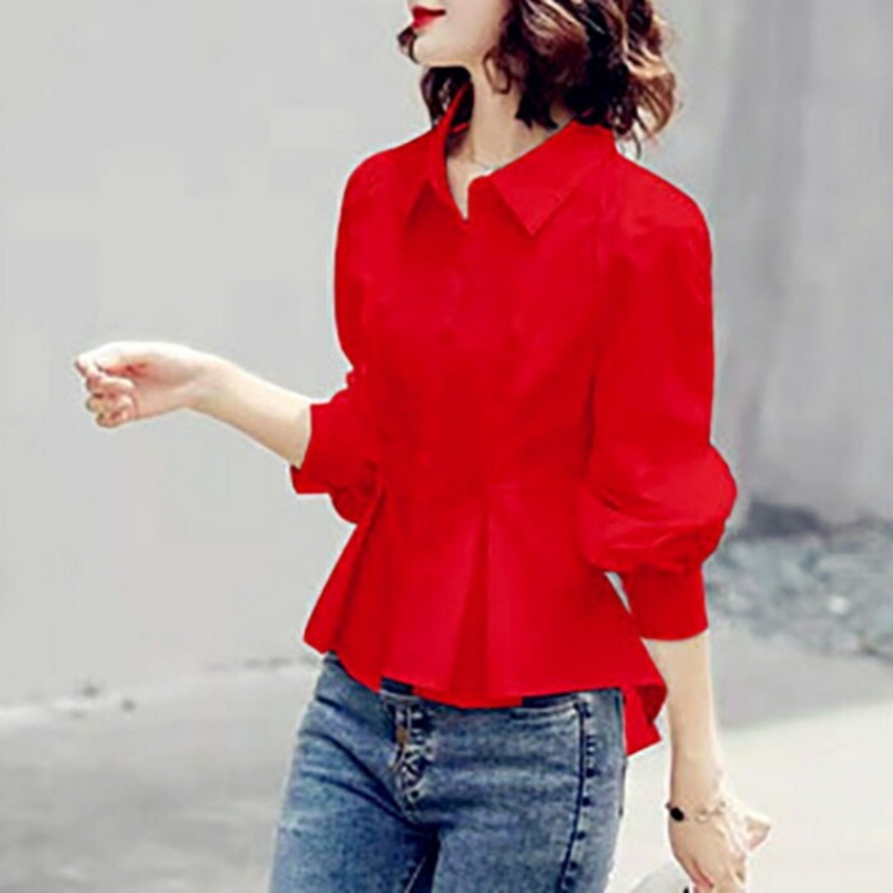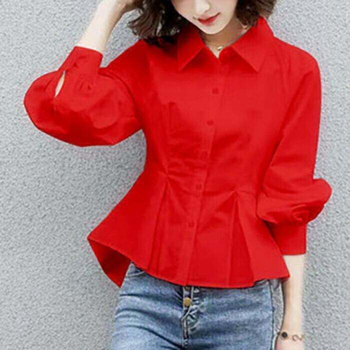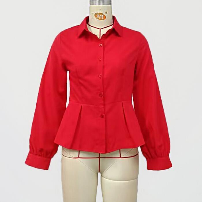 全2色 大きいサイズ トップス シャツ ブラウス タック ペプラム エレガント レディース 大人 可愛い きれいめ カジュアル フェミニン 長袖 フレア 上品 通勤 オフィス シンプル 体型カバー レッド 赤 ホワイト 白 春 冬 秋 20代 30代 40代 50代