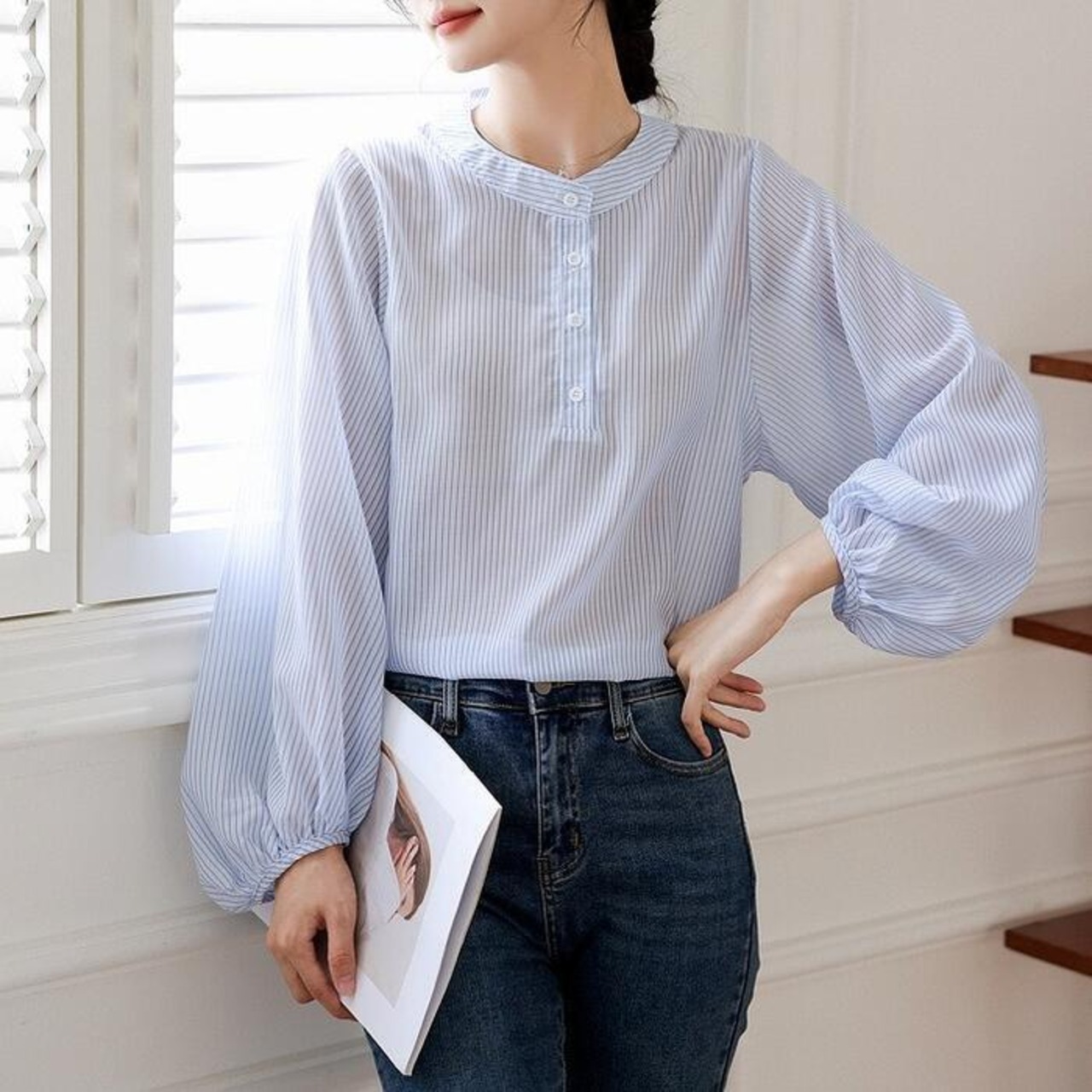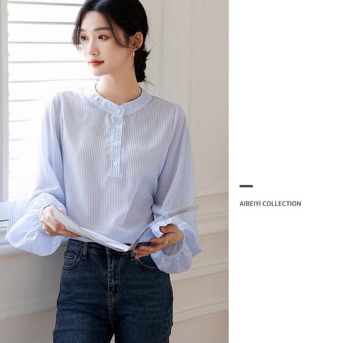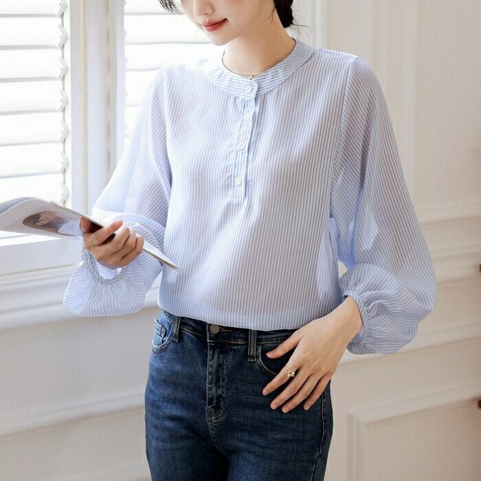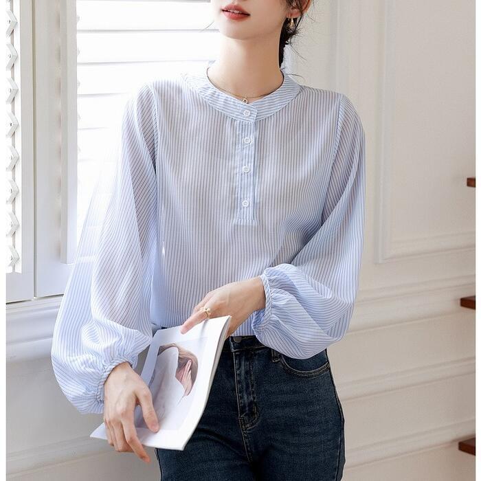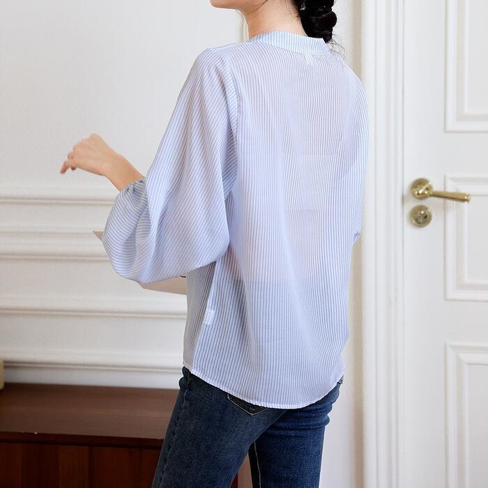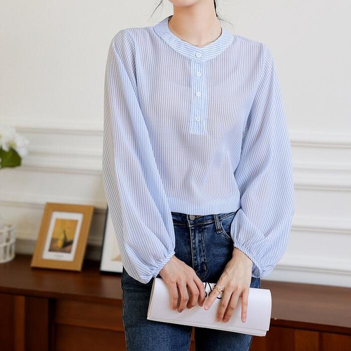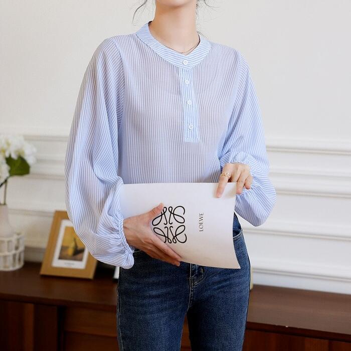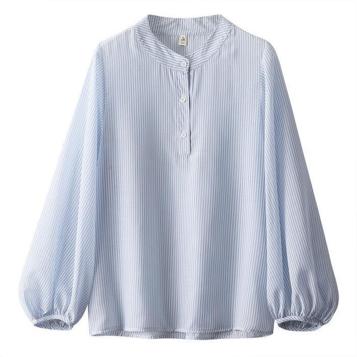 大きいサイズ トップス シャツ ブラウス ストライプ ヘンリーネック エレガント レディース 大人 可愛い きれいめ カジュアル フェミニン 長袖 パフスリーブ シンプル ゆったり 体型カバー 通勤 オフィス 透け感 青 ブルー 春 秋 冬 20代 30代 40代 50代