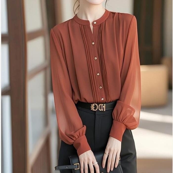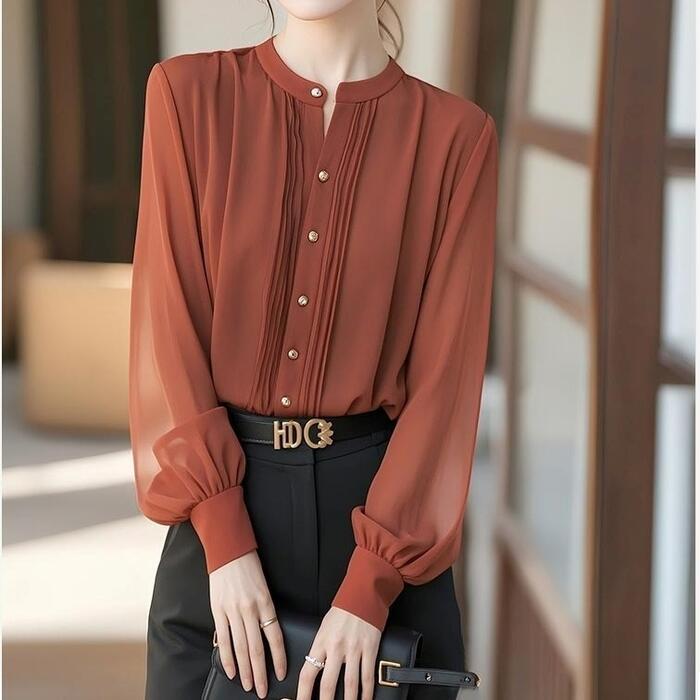 大きいサイズ トップス シャツ ブラウス シフォン パフスリーブ エレガント レディース 大人 可愛い きれいめ カジュアル フェミニン 長袖 ボリュームスリーブ ゆったり 体型カバーナチュラル クラシカル レッド 赤 春 秋 夏 冬 20代 30代 40代 50代