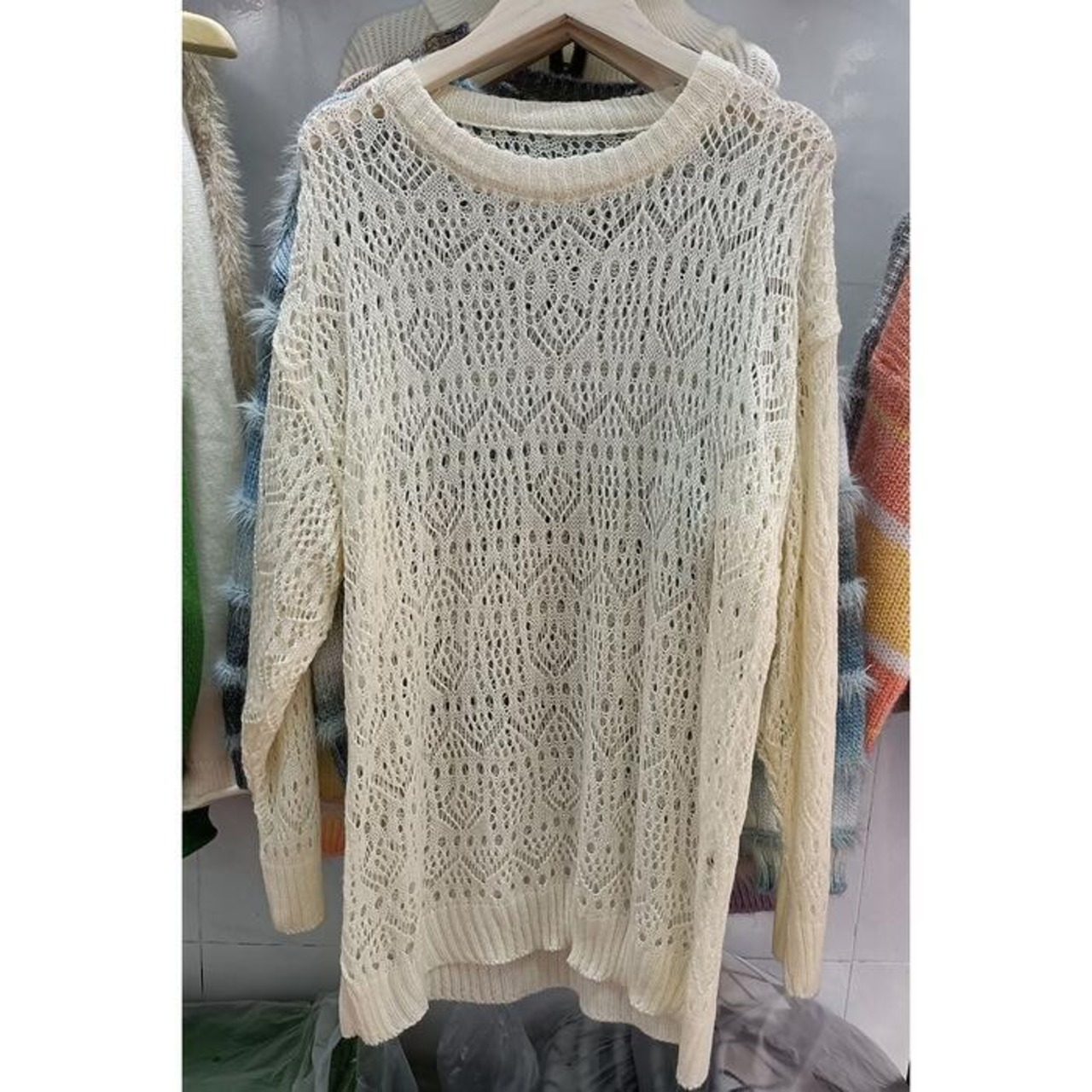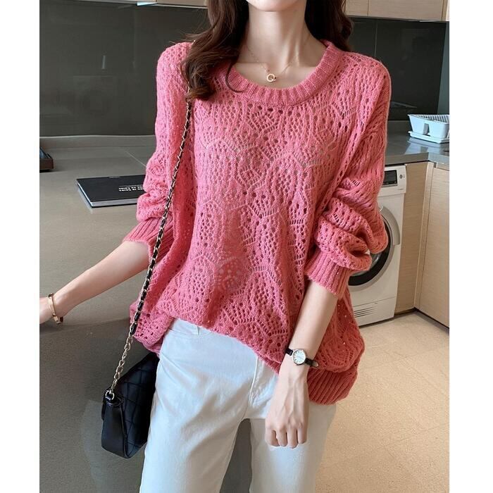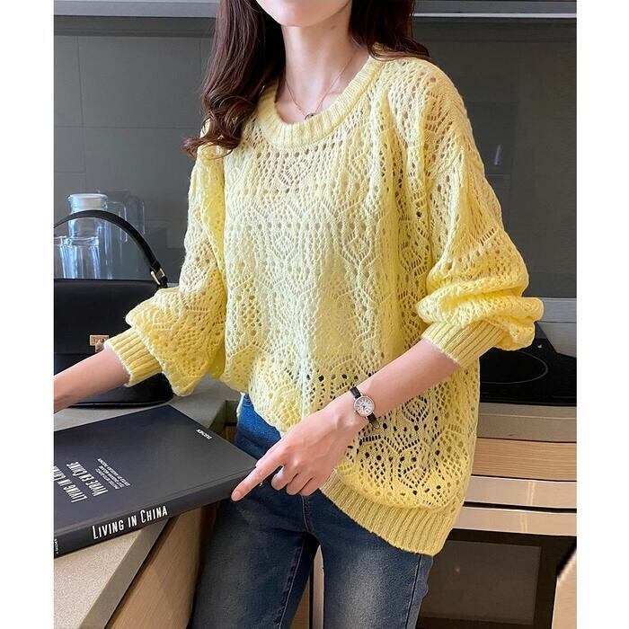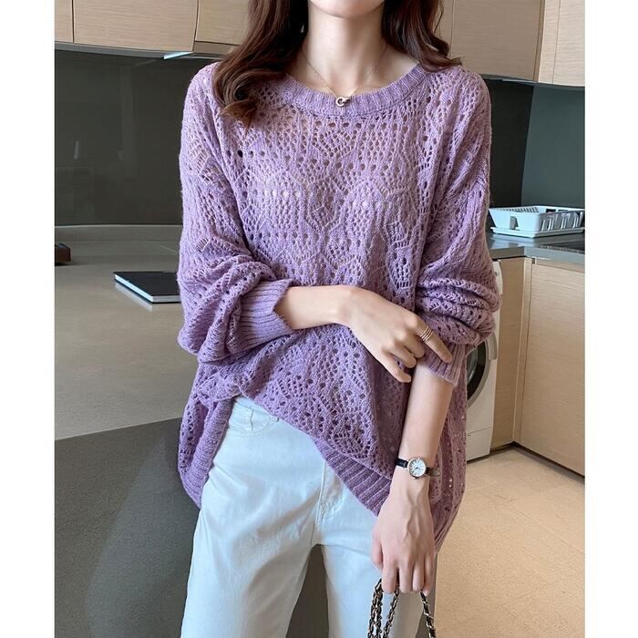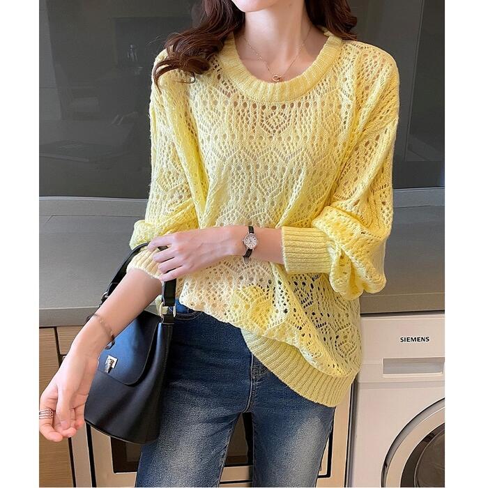 全4色 大きいサイズ 体型カバー レイヤード フェミニン ニット トップス カットソー 透かし編み クロシェ セーター エレガント きれいめ カジュアル 大人 可愛い レディース 長袖 プルオーバー 透け感 薄手 シンプル ゆったり パープル 紫 イエロー ホワイト ピンク 春 夏 秋 20代 30代 40代 50代