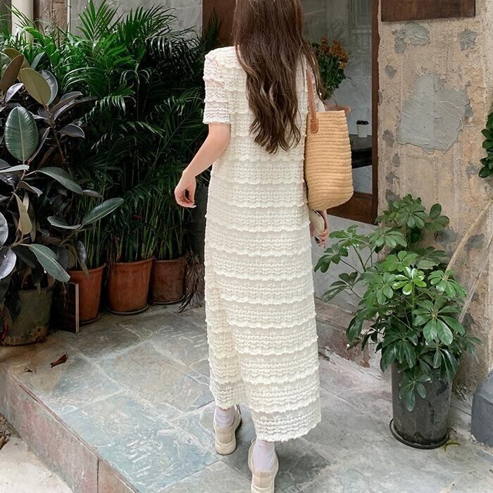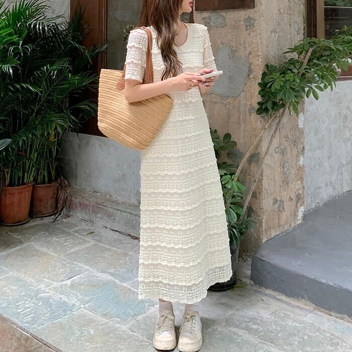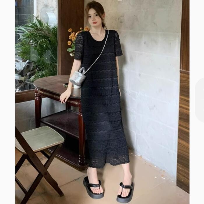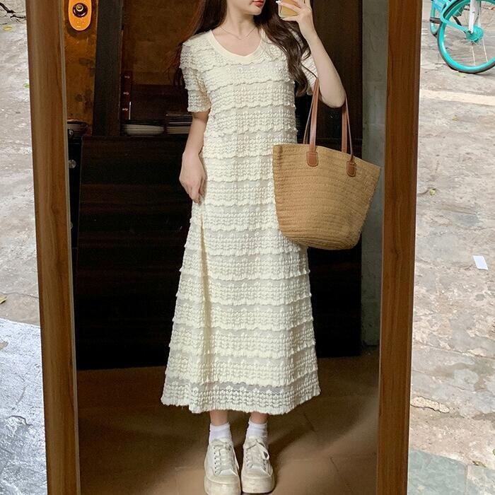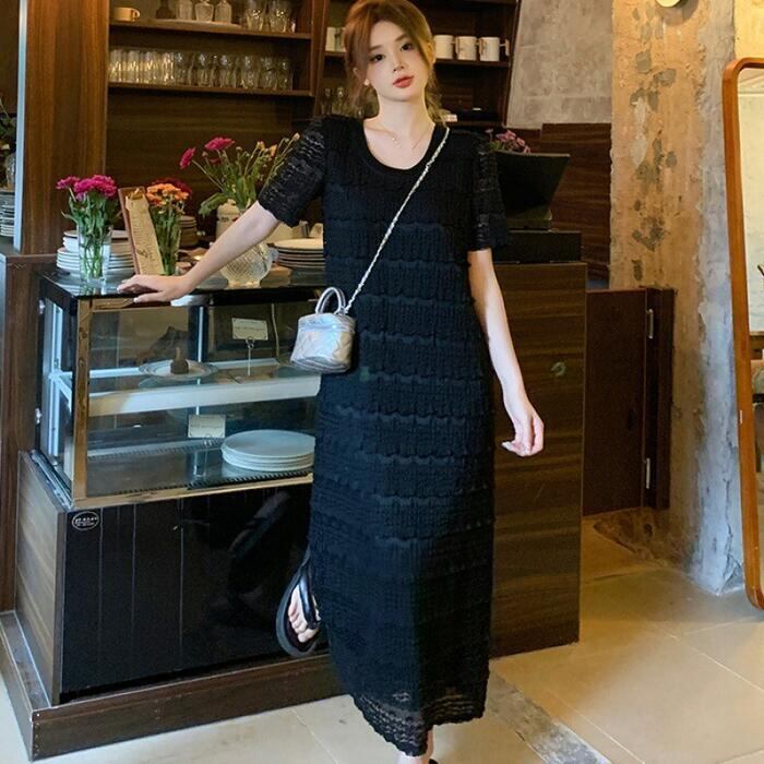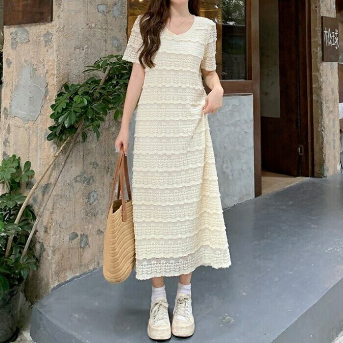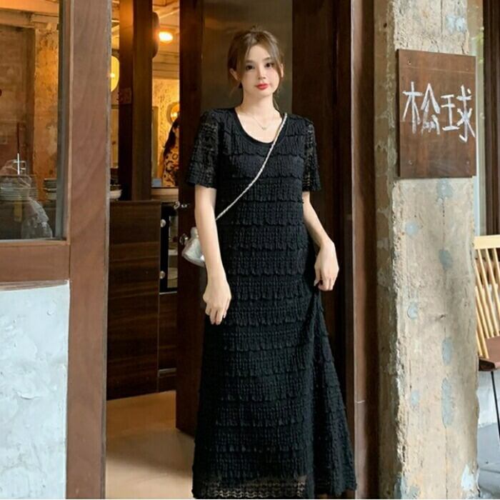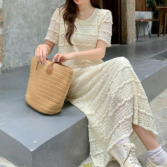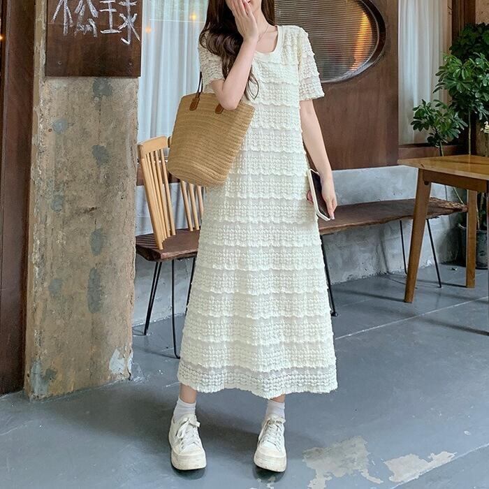 全2色 大きいサイズ 体型カバー ワンピース ワンピ ドレス レース ティアード 袖あり フリル レディース エレガント きれいめ カジュアル 大人 可愛い フェミニン ミモレ丈 半袖 Aライン ゆったり シンプル ホワイト 白 ブラック 黒 春 夏 秋 20代 30代 40代 50代