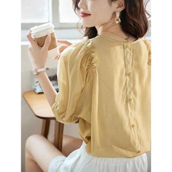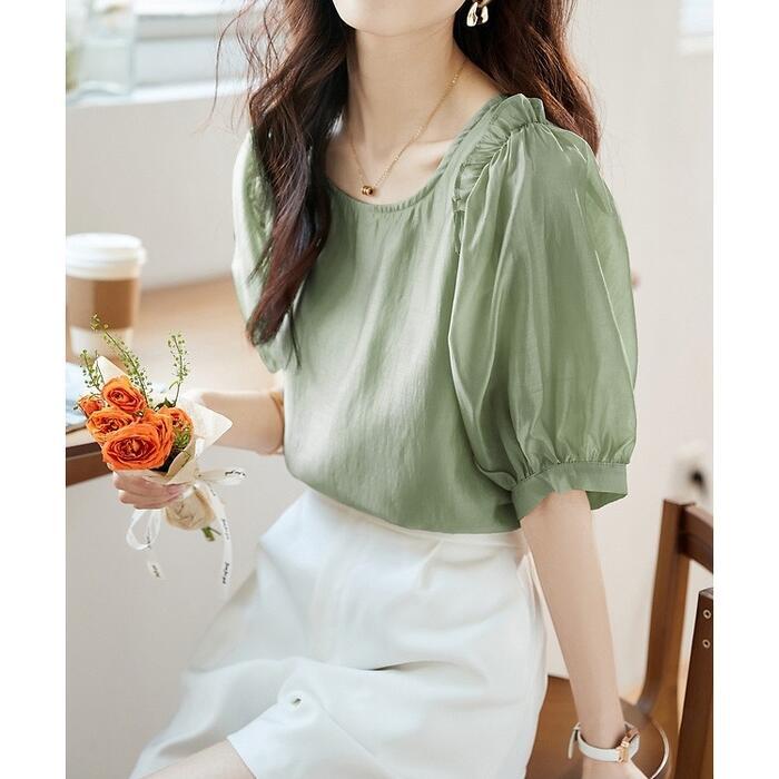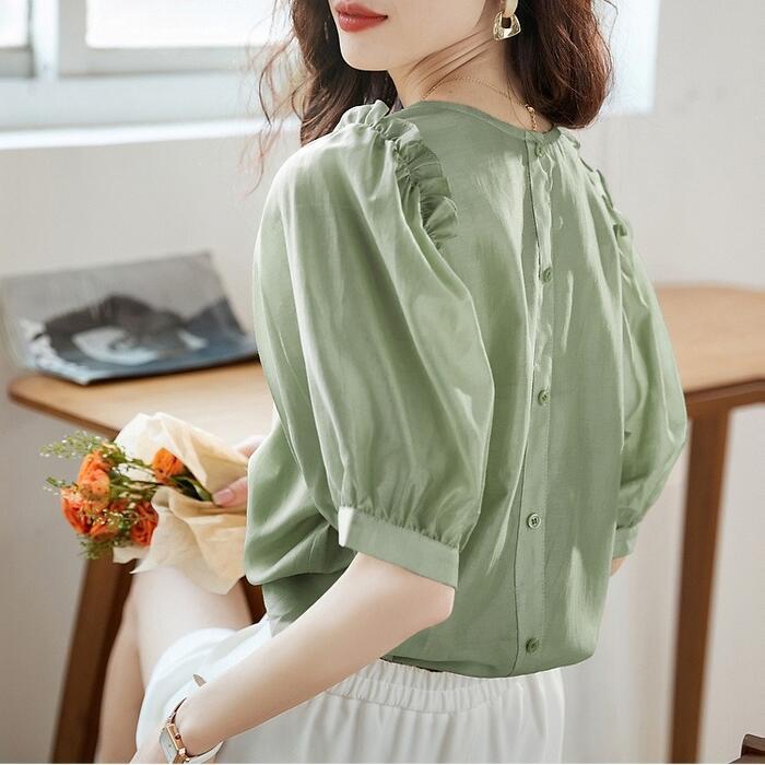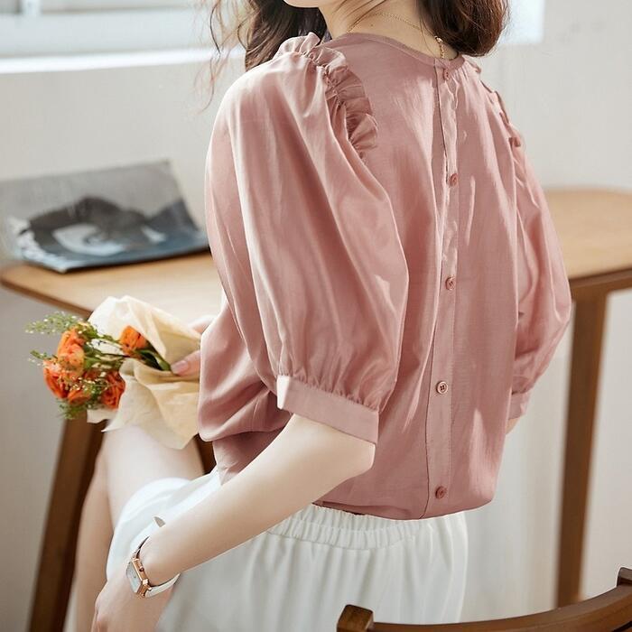 全3色 大きいサイズ 体型カバー トップス シャツ ブラウス パフスリーブ ブラウス バックボタン エレガント レディース 大人 可愛い きれいめ カジュアル フェミニン 半袖 五分袖 ナチュラル シフォン ピンク イエロー グリーン 緑 春 秋 夏 20代 30代 40代 50代