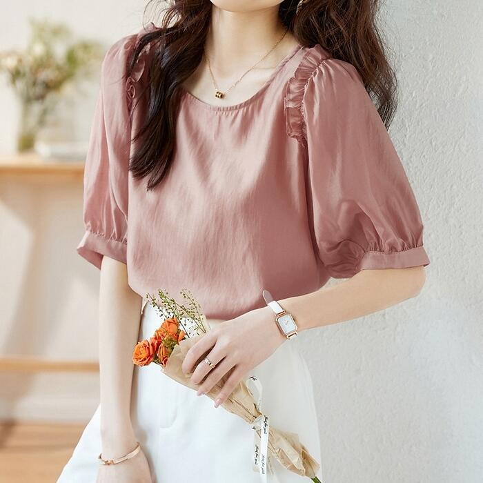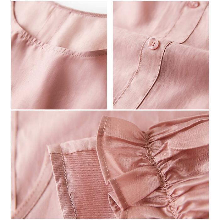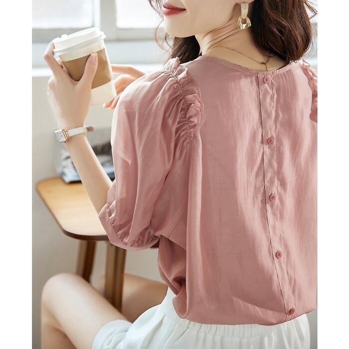 バックボタンとフリルが可愛いシフォンブラウス。