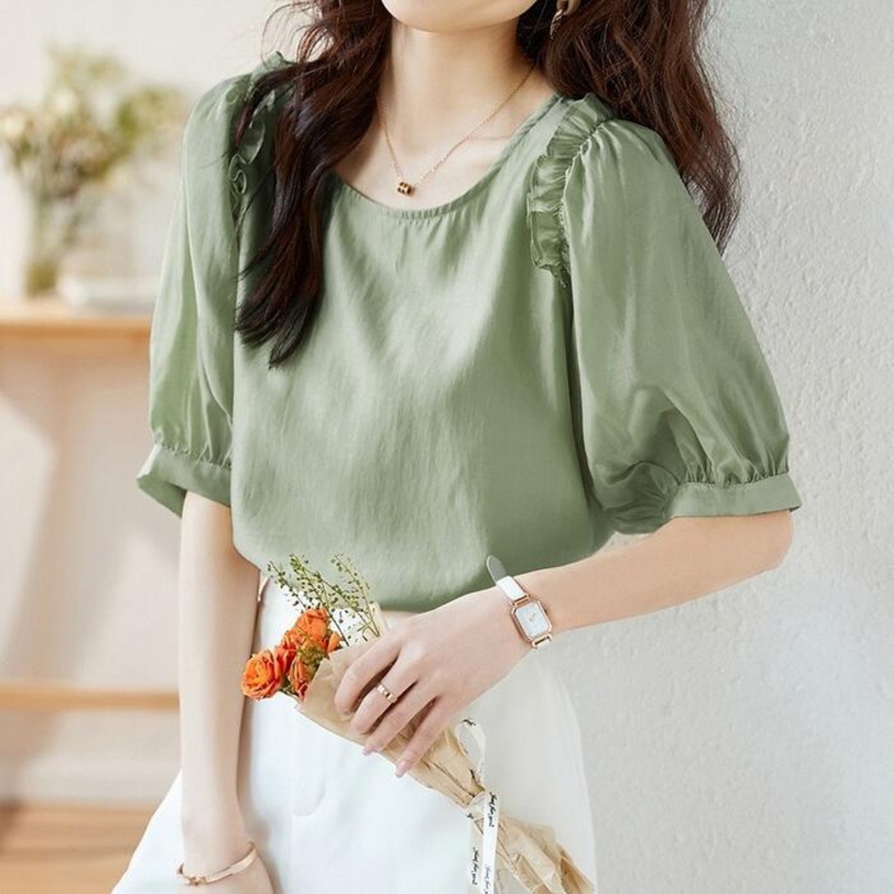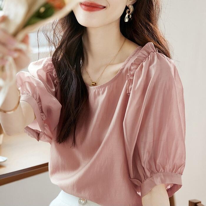 ふんわりしたパフスリーブで女性らしい柔らかな印象に。