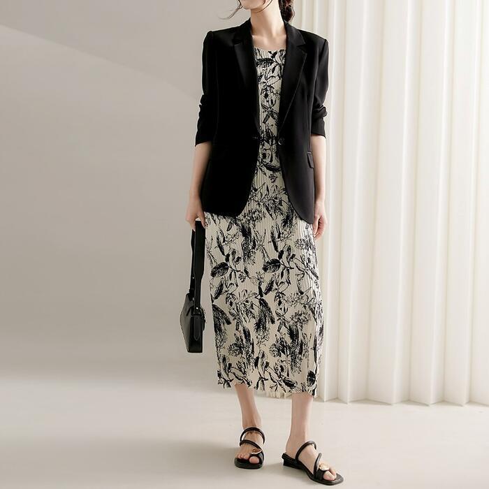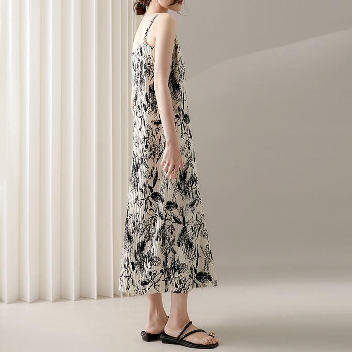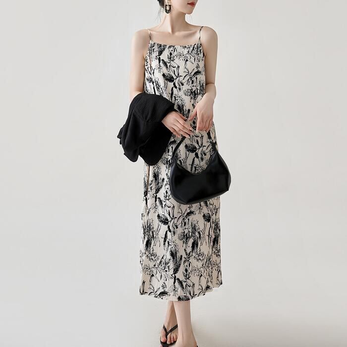 モノトーンのボタニカル柄がモードな印象のキャミワンピース。